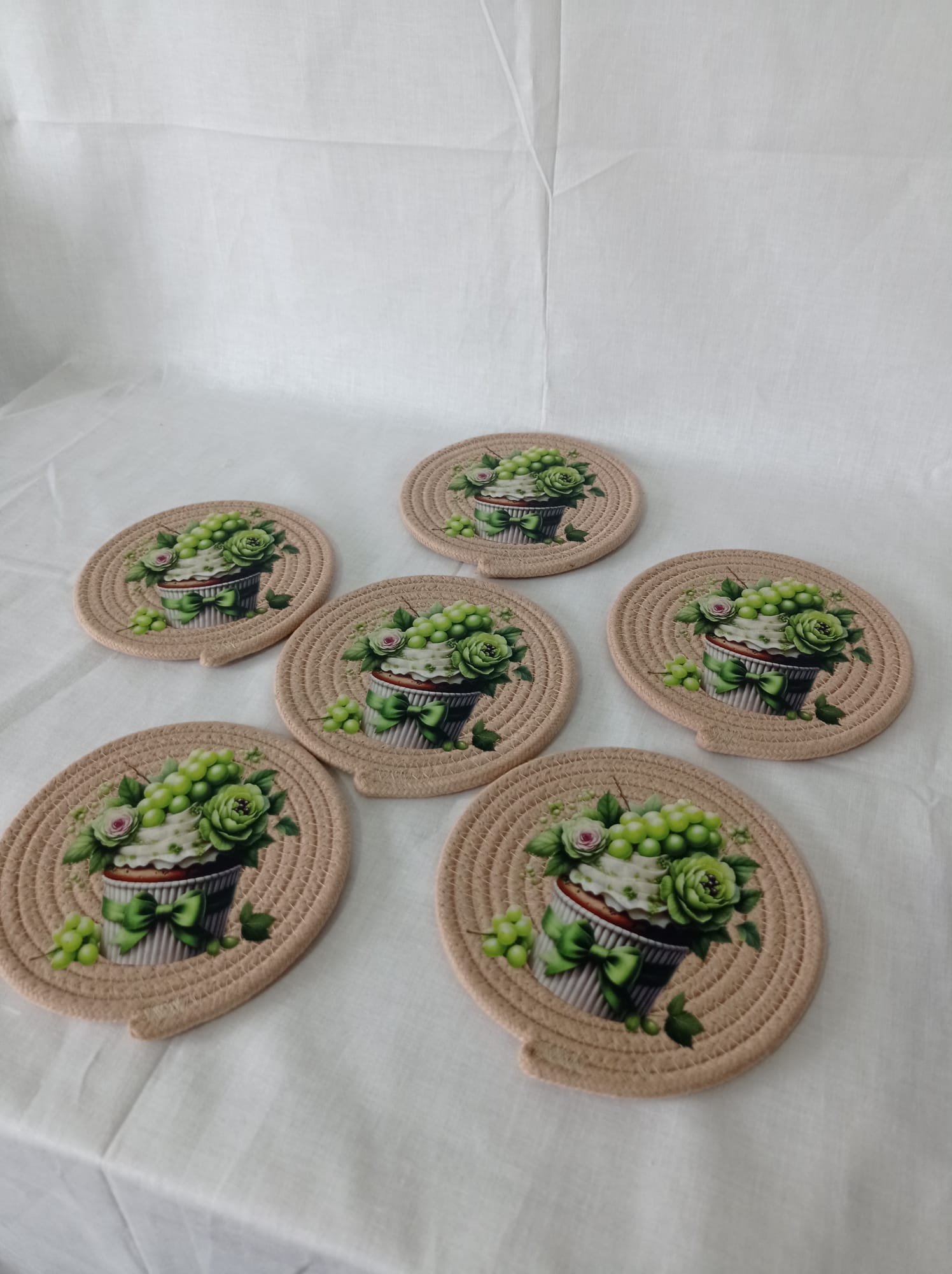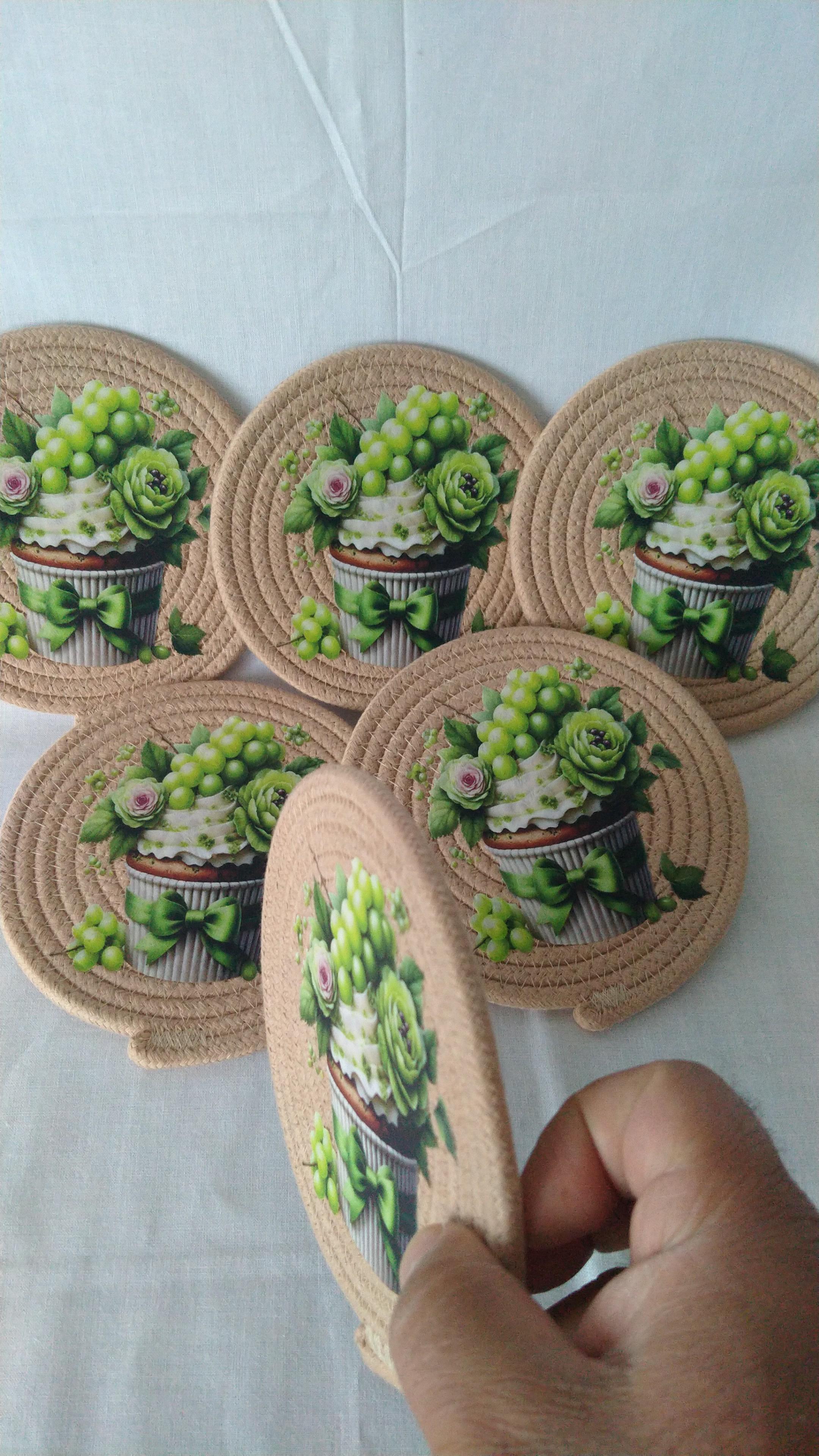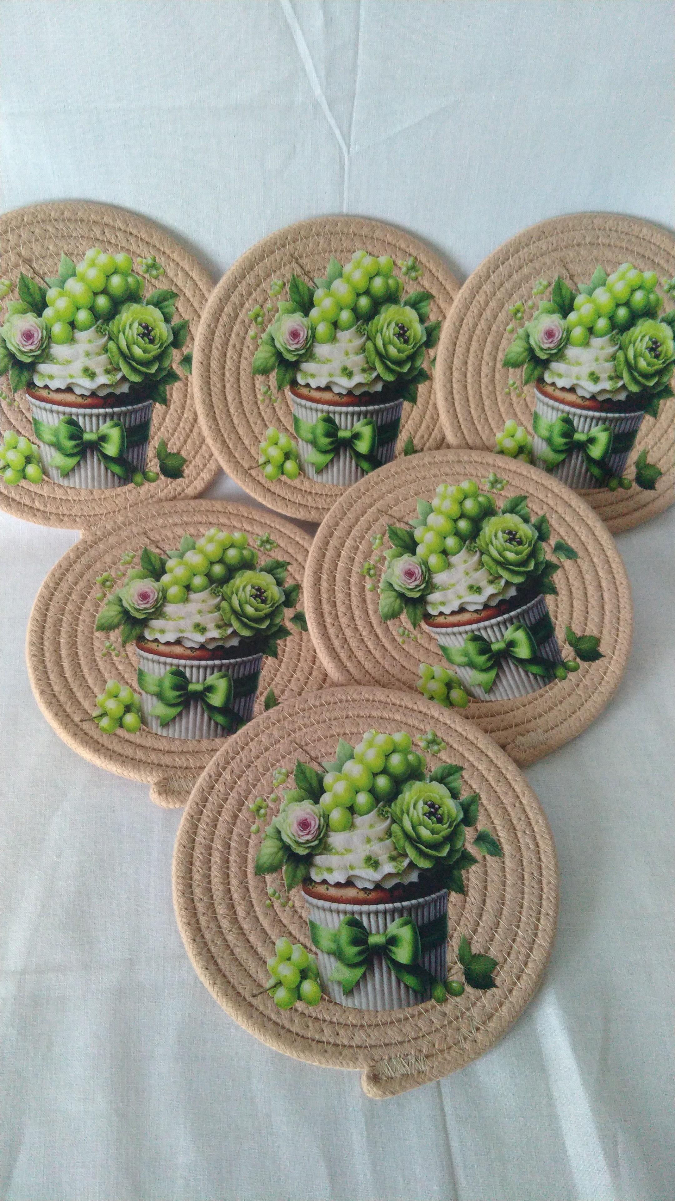 6 adet dijital transfer baskılı pamuklu kordon ipten bardak altlıkları Çap 14 cm