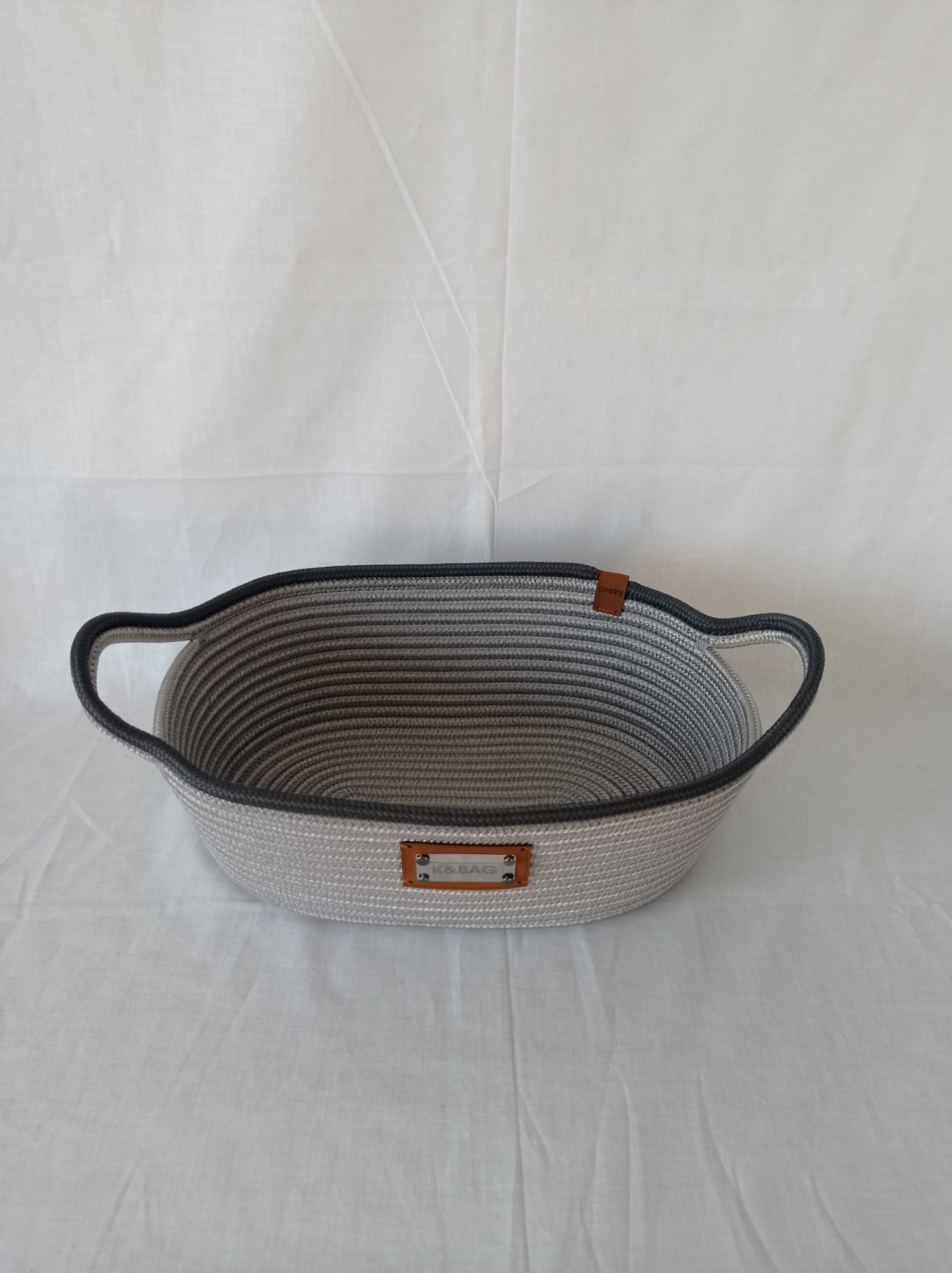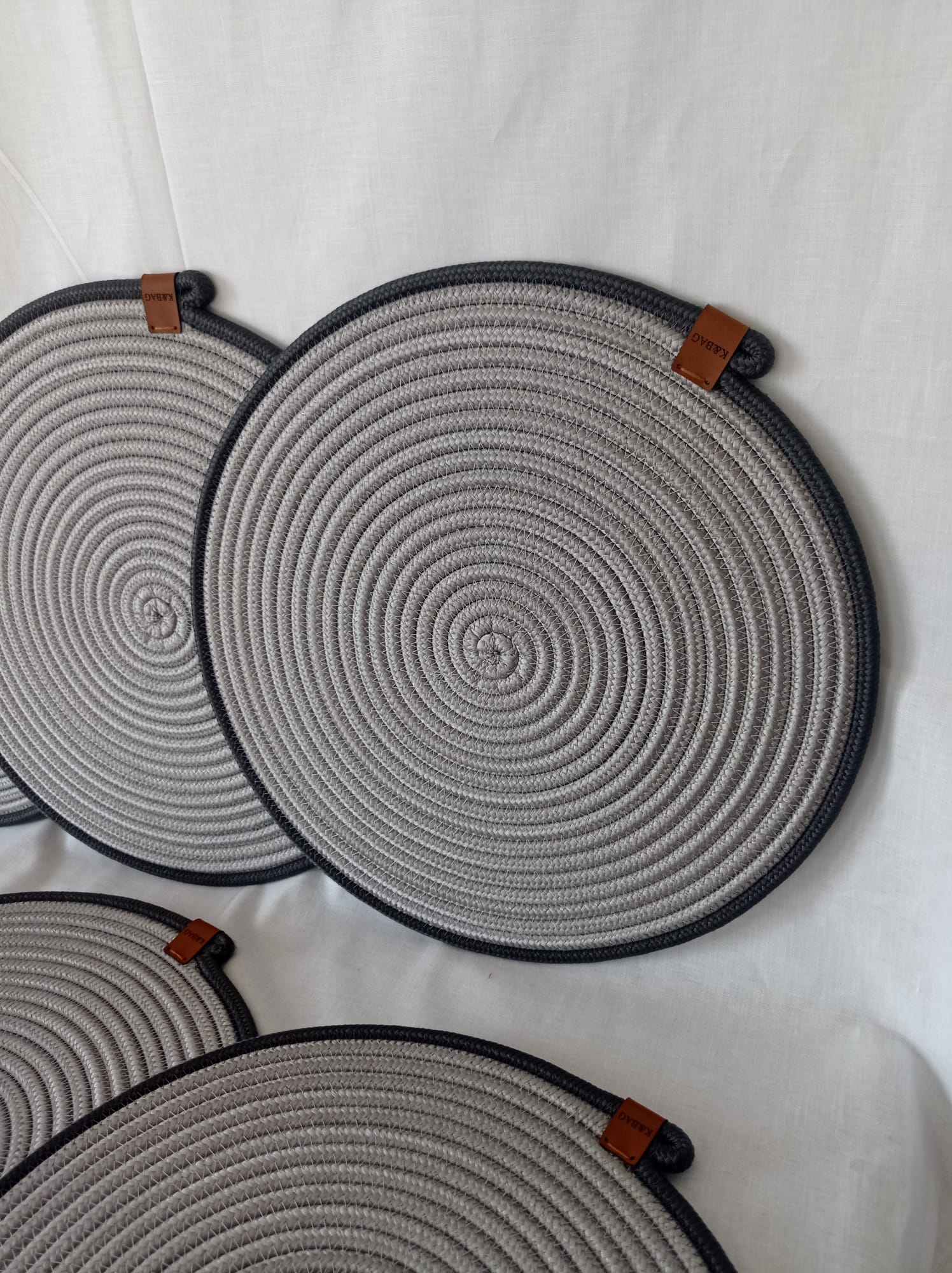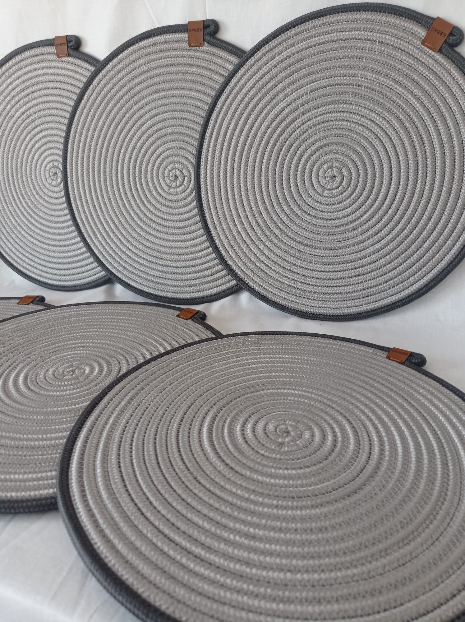 Açık gri-antrasit jüt SUPLA ve 1 adet ekmek sepeti. Suplaların çapı 35 cm, sepet uzunluk 32 cm, eni 25 cm, yükseklik 12 cm