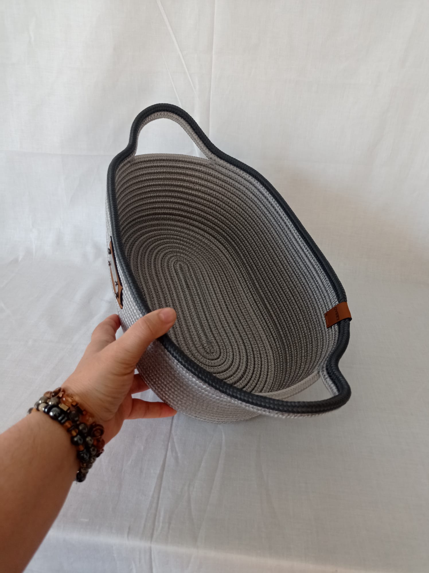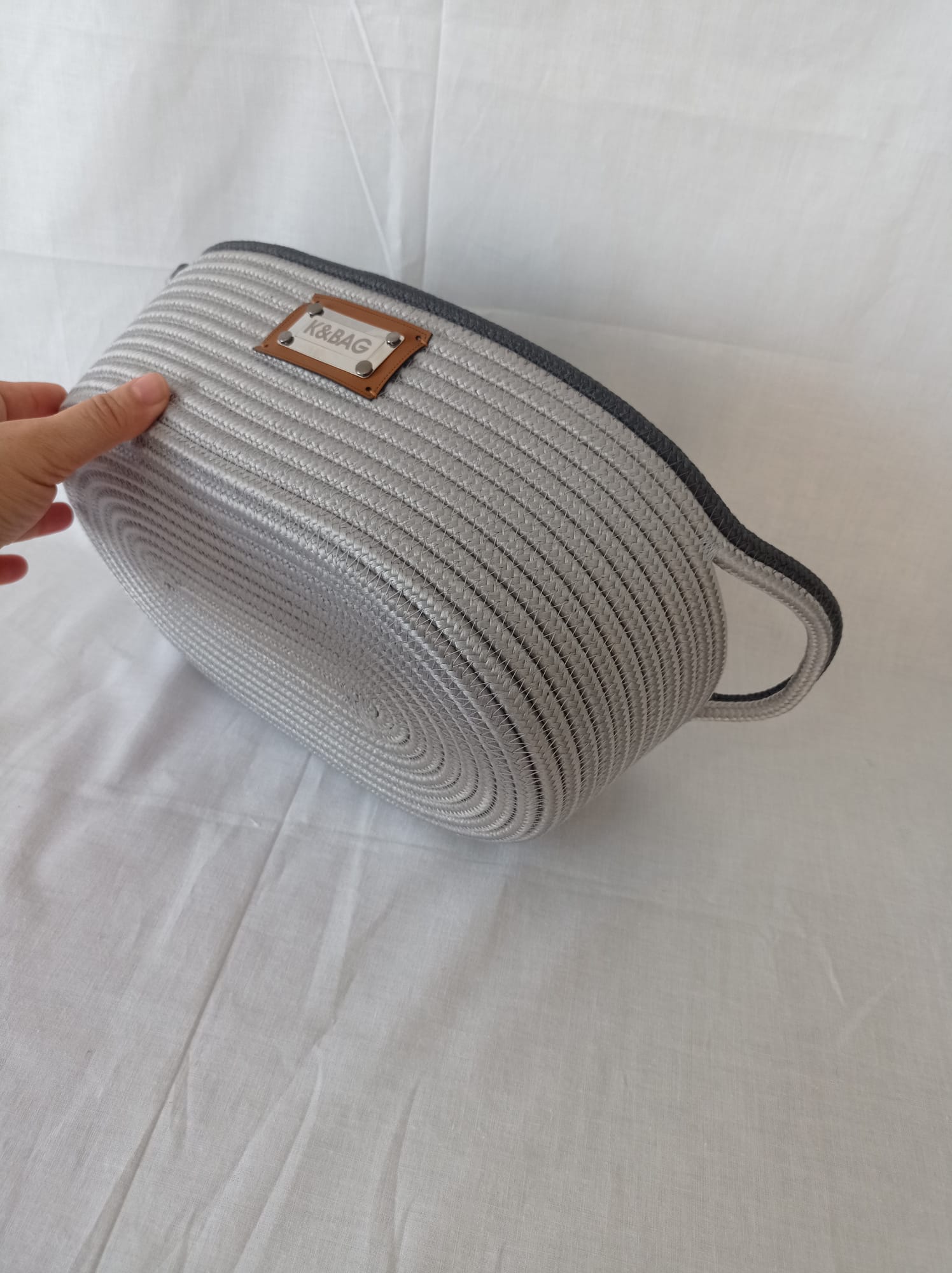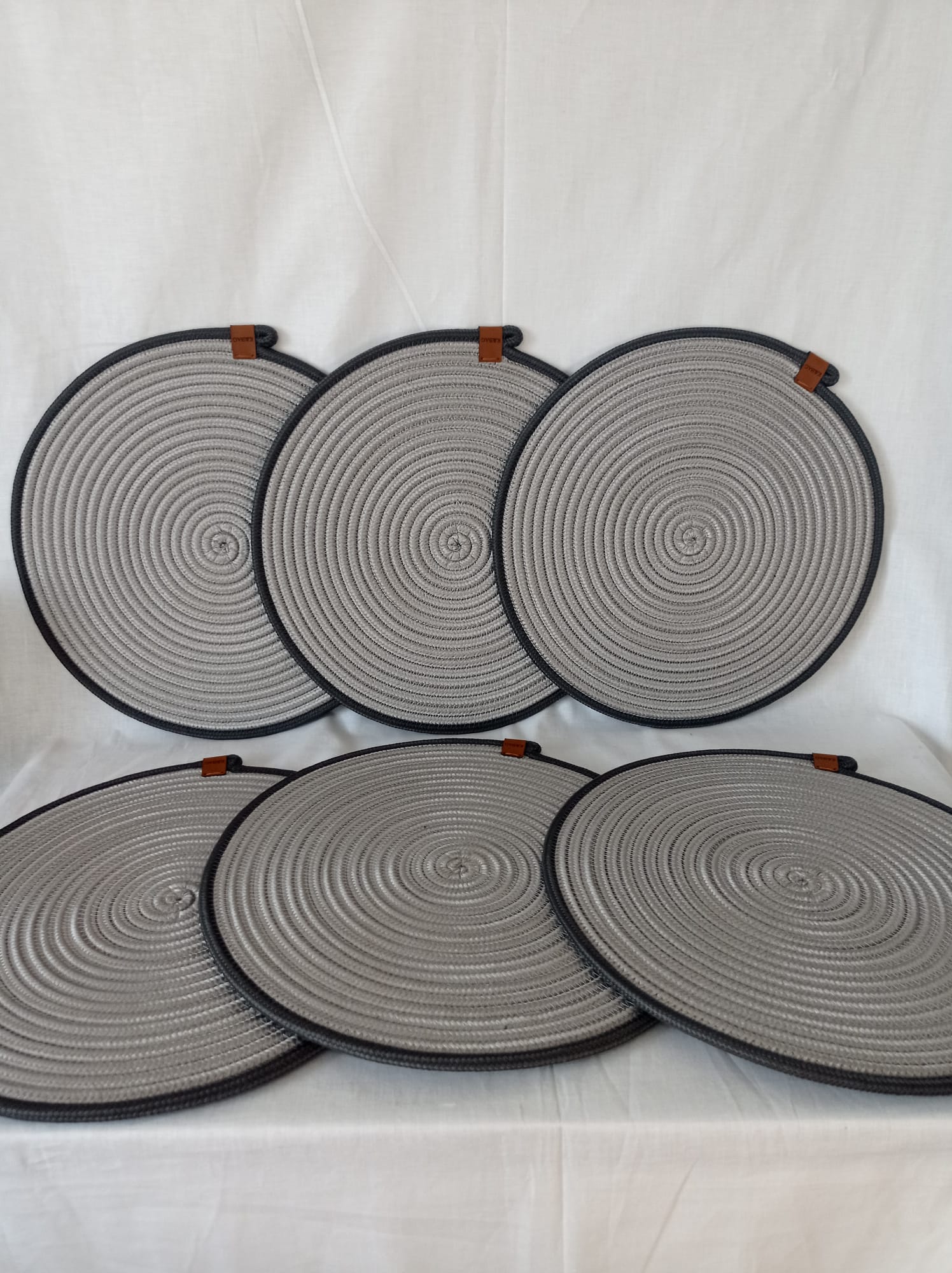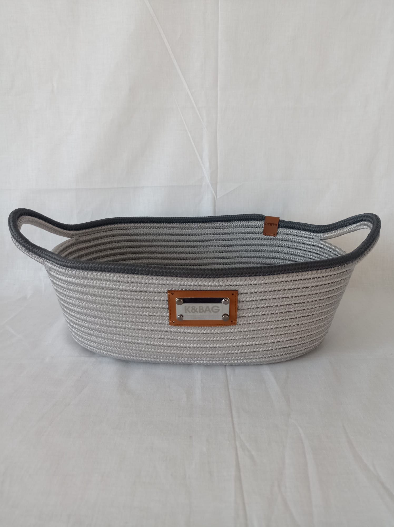 Açık gri-antrasit jüt SUPLA ve 1 adet ekmek sepeti. Suplaların çapı 35 cm, sepet uzunluk 32 cm, eni 25 cm, yükseklik 12 cm