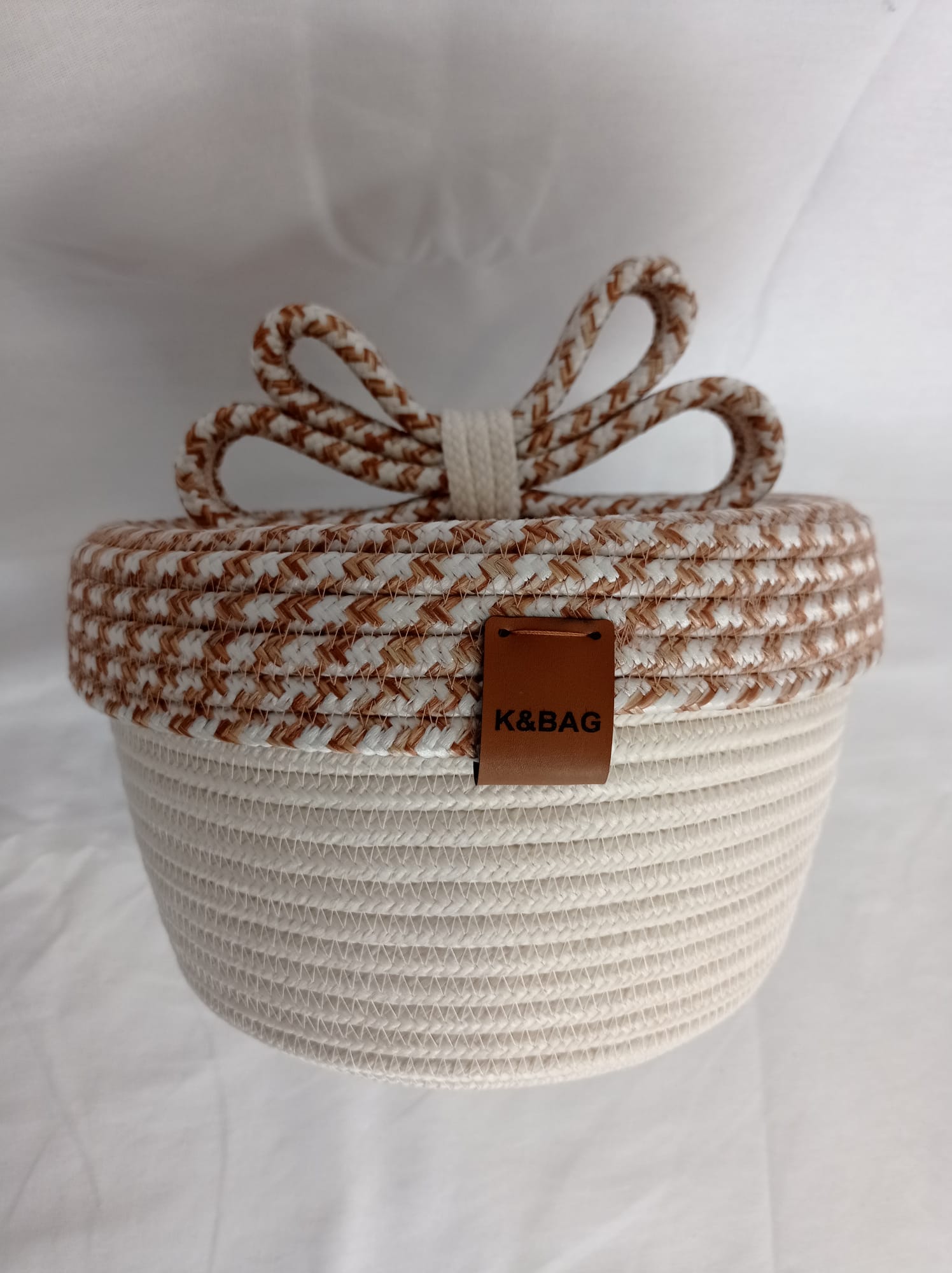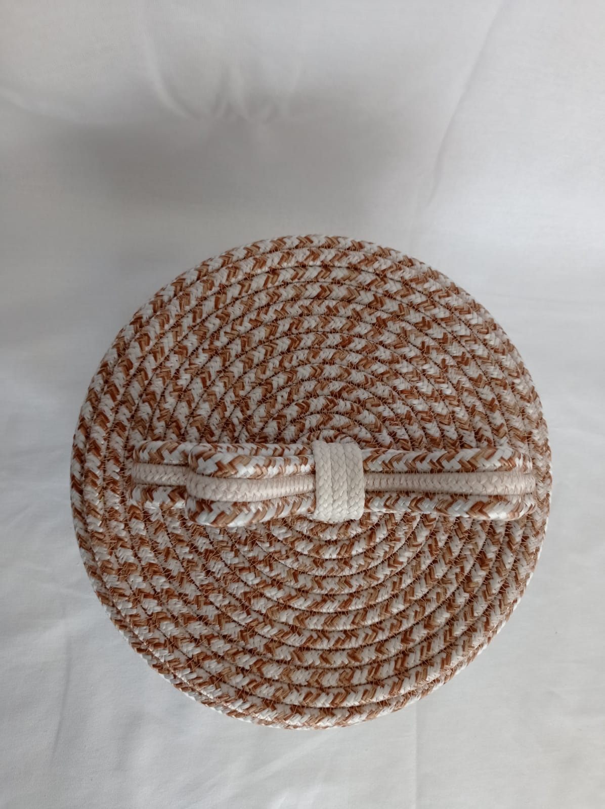 Jüt ipten yapılmış fiyonklu çok amaçlı kapaklı sepet.İç çapı 23.5 cm,yükseklik kapaksız 14.5 cm,yükseklik kapaklı 15.5 (fiyonklu yükseklik ölçüsü 24 cm)