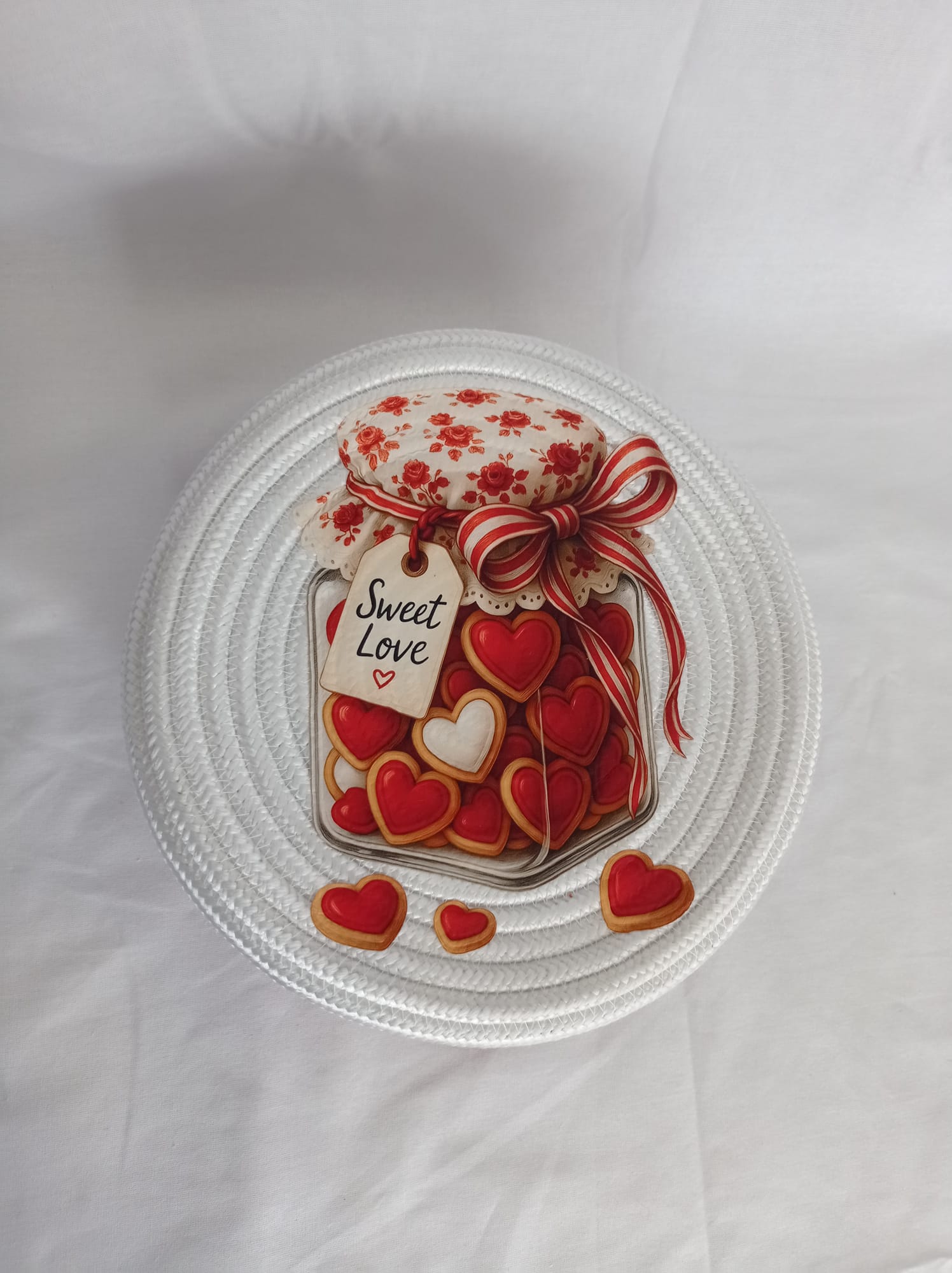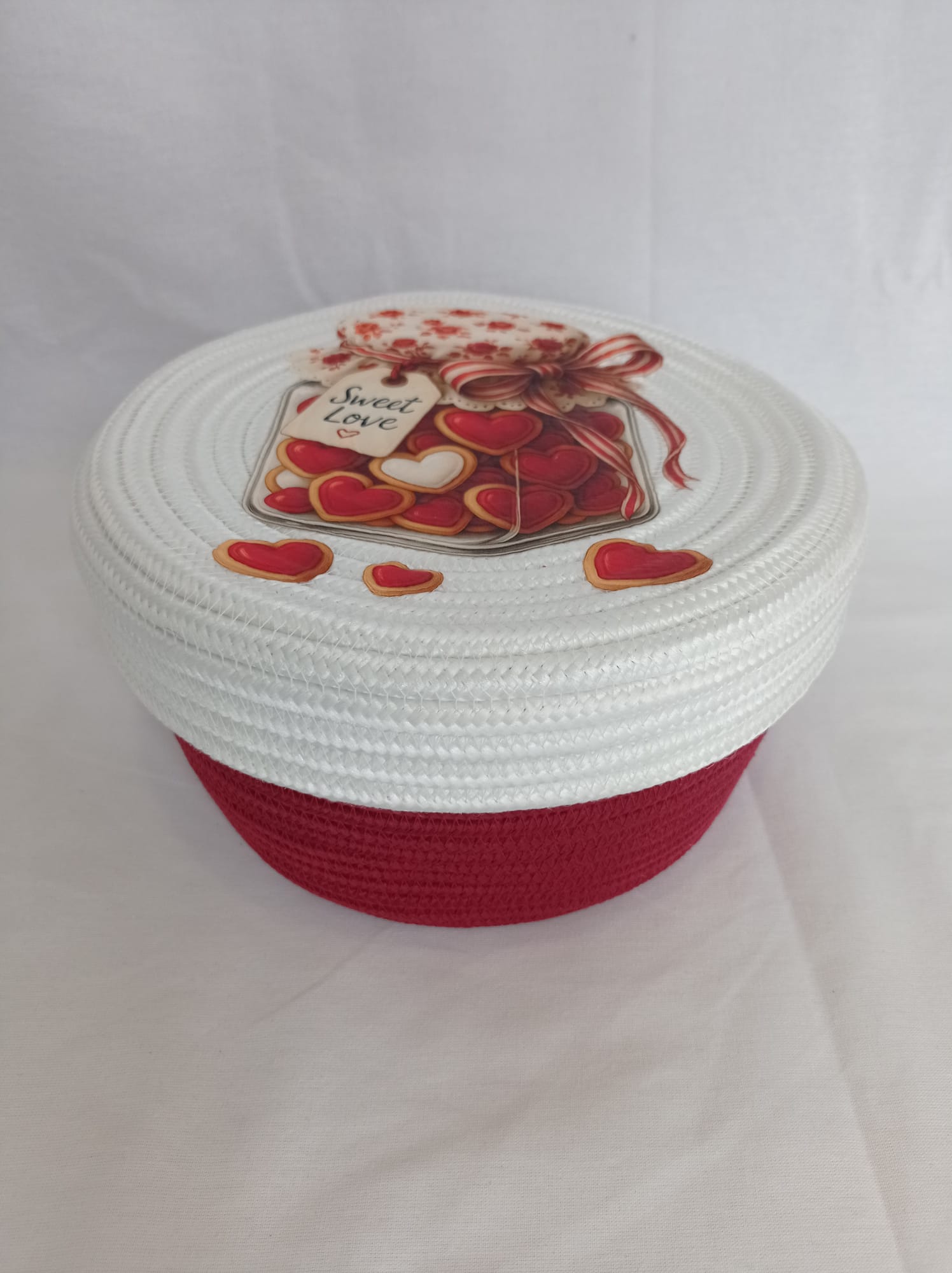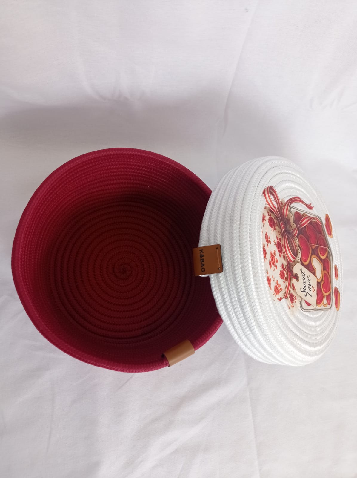 Jüt ipten yapılmış çok amaçlı kapaklı sepet.iç çapı 23 cm. yükseklik kapaksız 13 cm,yükseklik kapaklı 14 cm