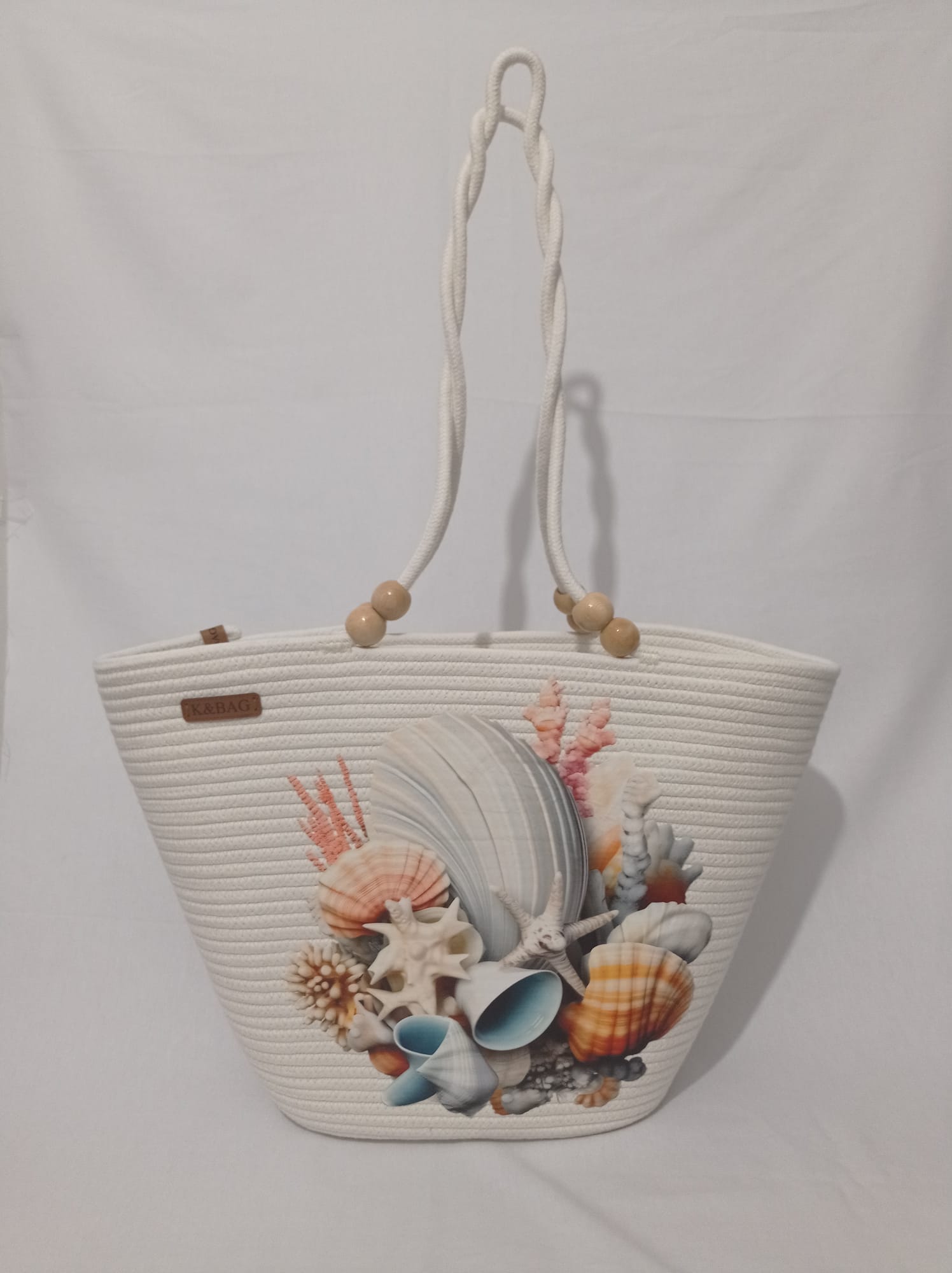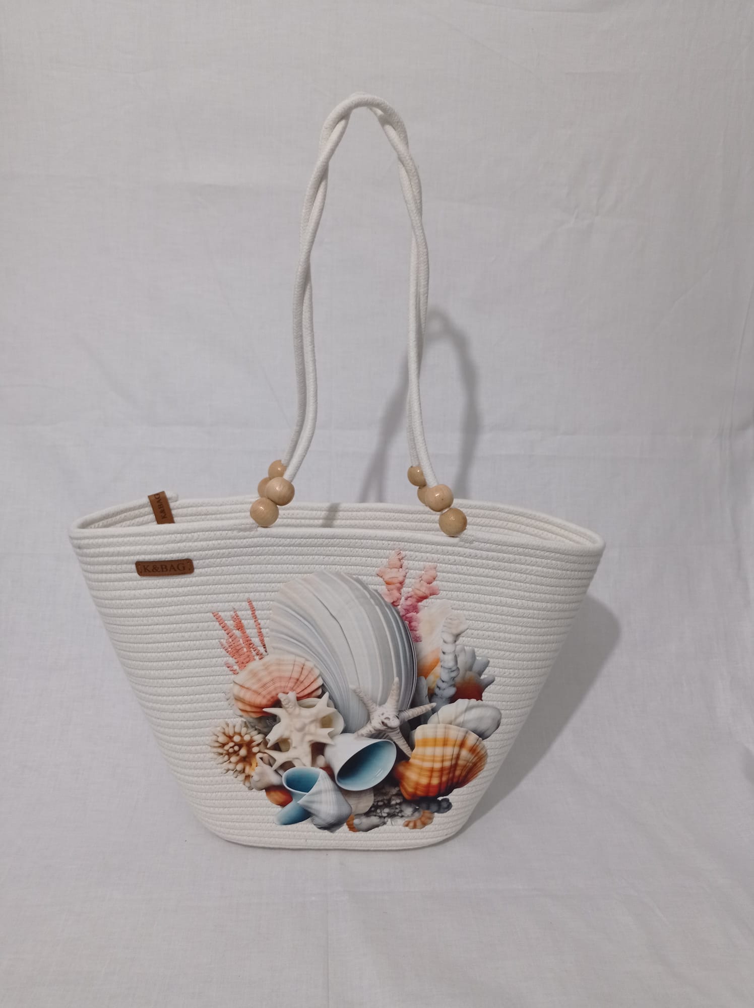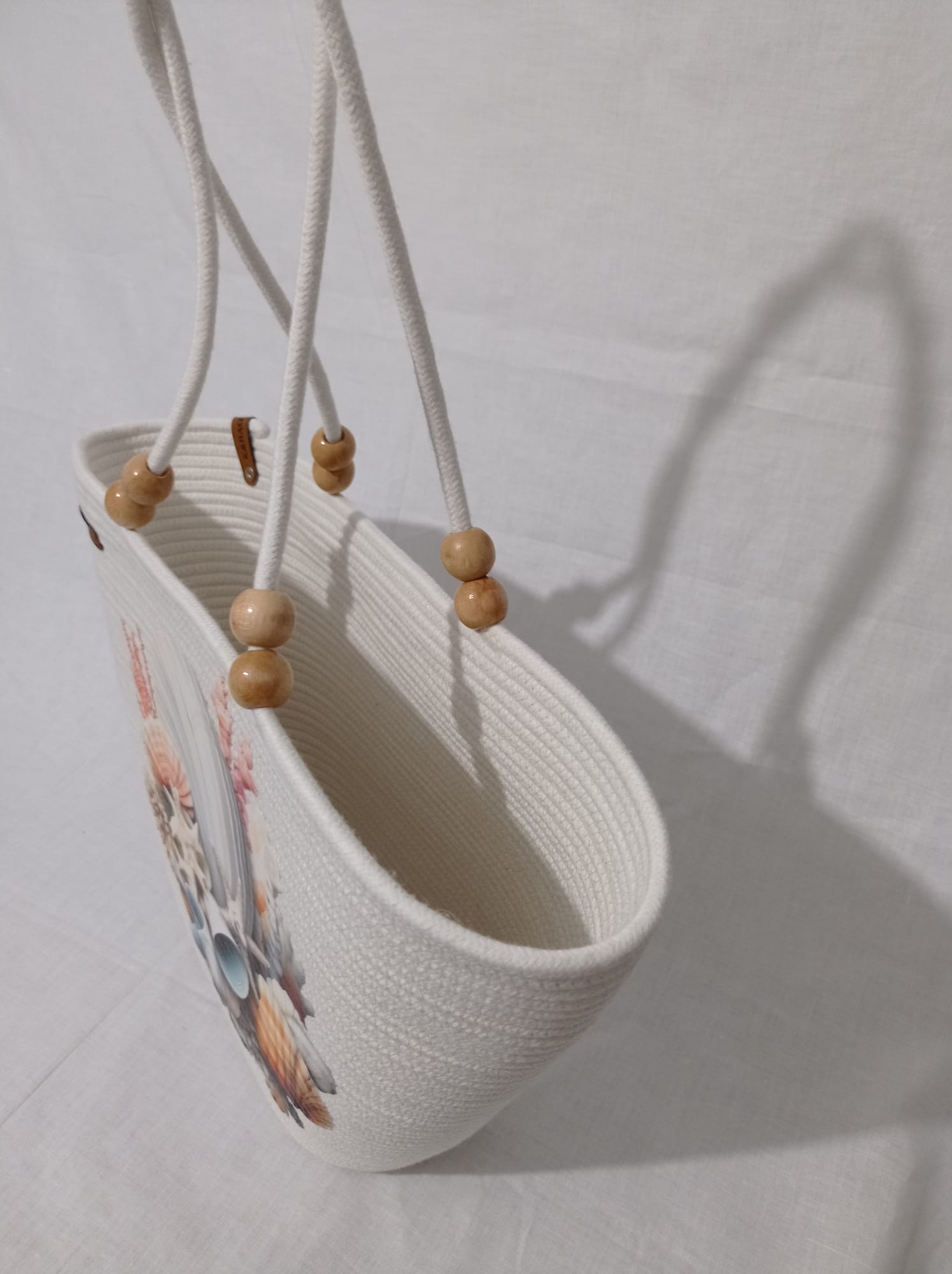 Beyaz, dijital transfer baskılı, ahşap boncuk detaylı, pamuklu jüt Kordon plaj çantası, yükseklik 30 cm genişlik 45 cm sap 70 cm uzunlukta