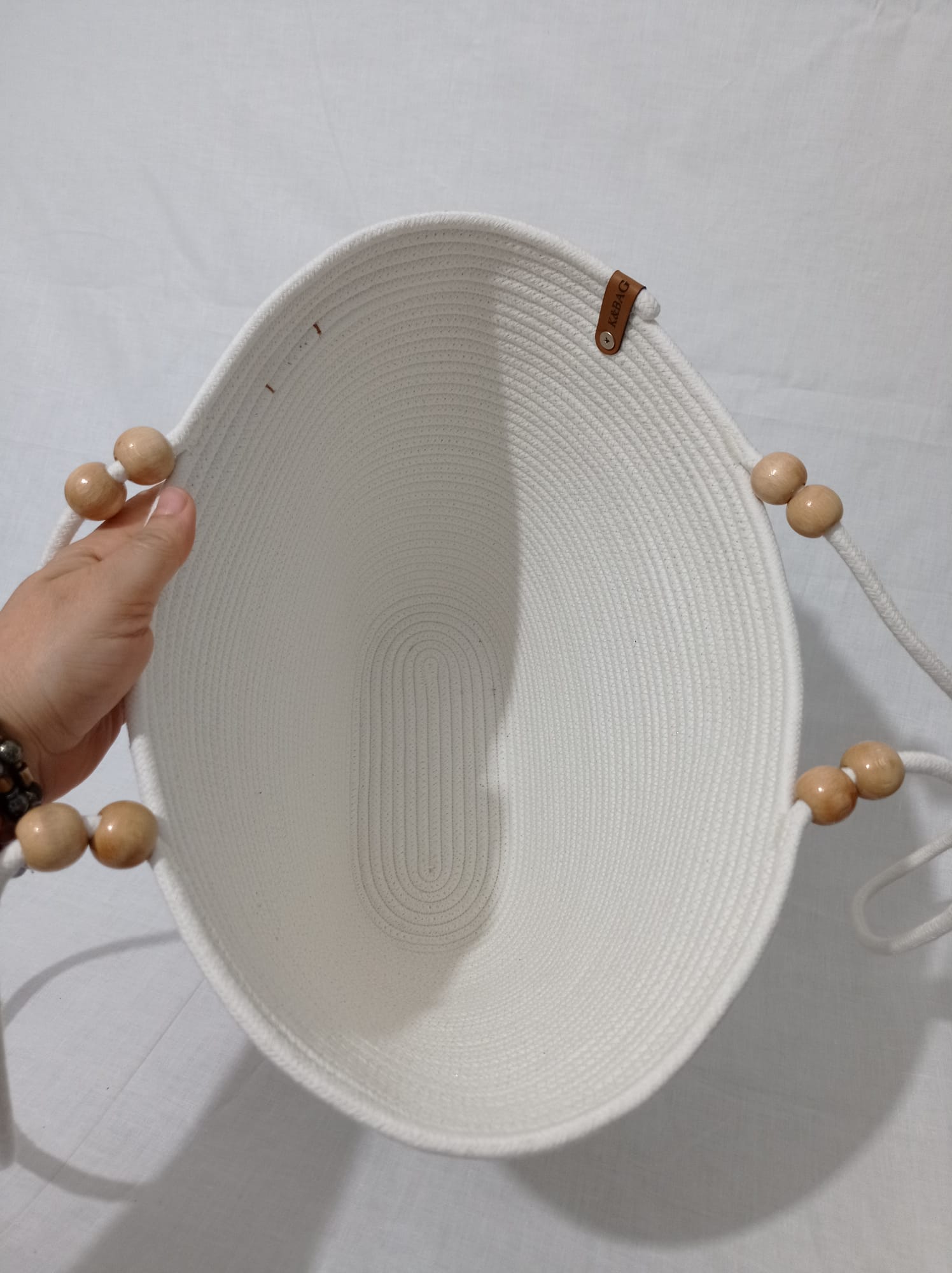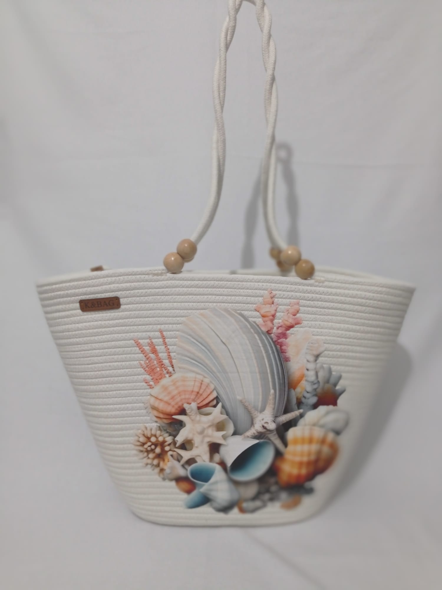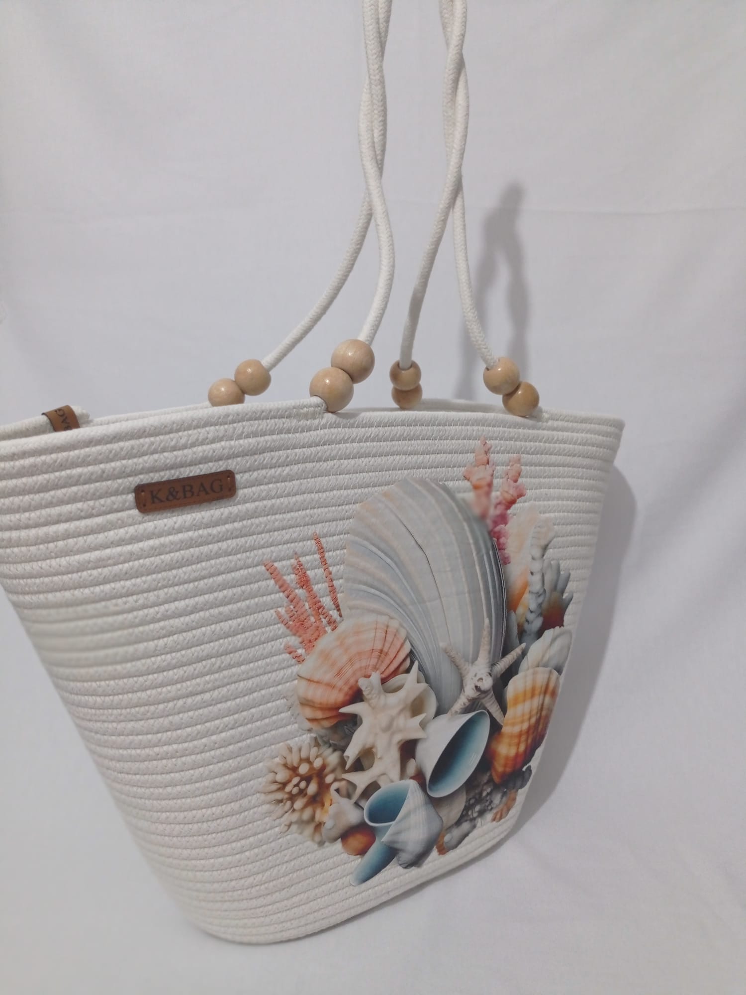 Beyaz, dijital transfer baskılı, ahşap boncuk detaylı, pamuklu jüt Kordon plaj çantası, yükseklik 30 cm genişlik 45 cm sap 70 cm uzunlukta