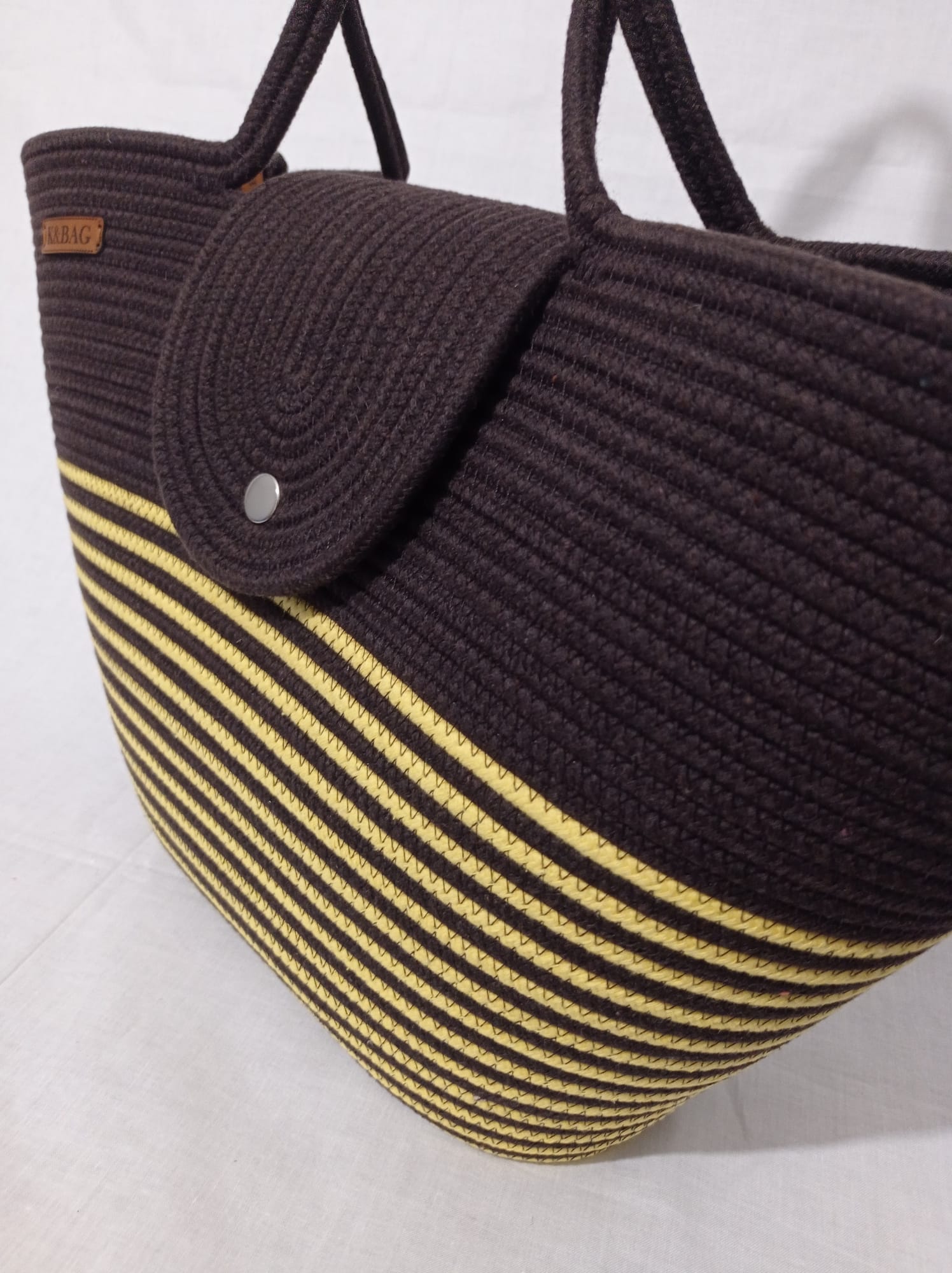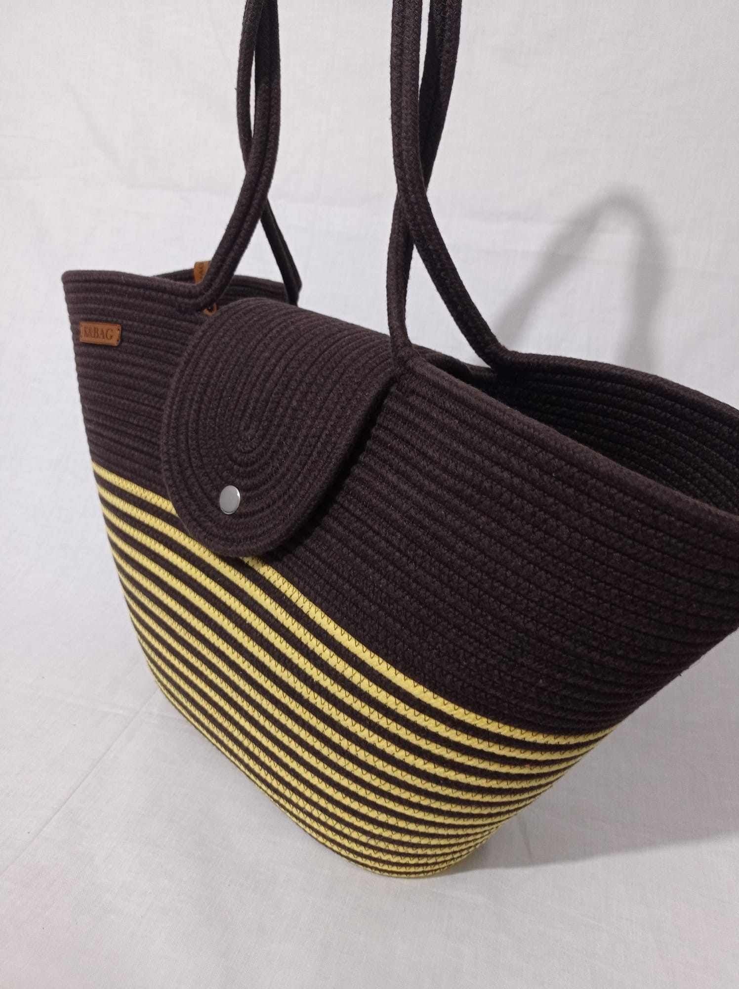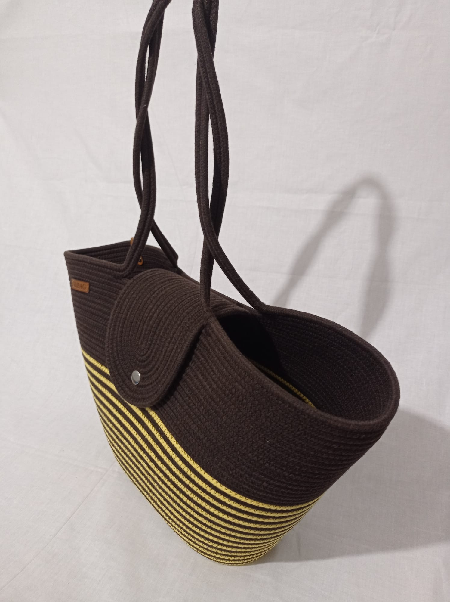 Kahverengi_Sarı kapaklı çanta, pamuklu jüt Kordon ip, yükseklik 30 cm genişlik 45 cm sap 70 cm uzunlukta