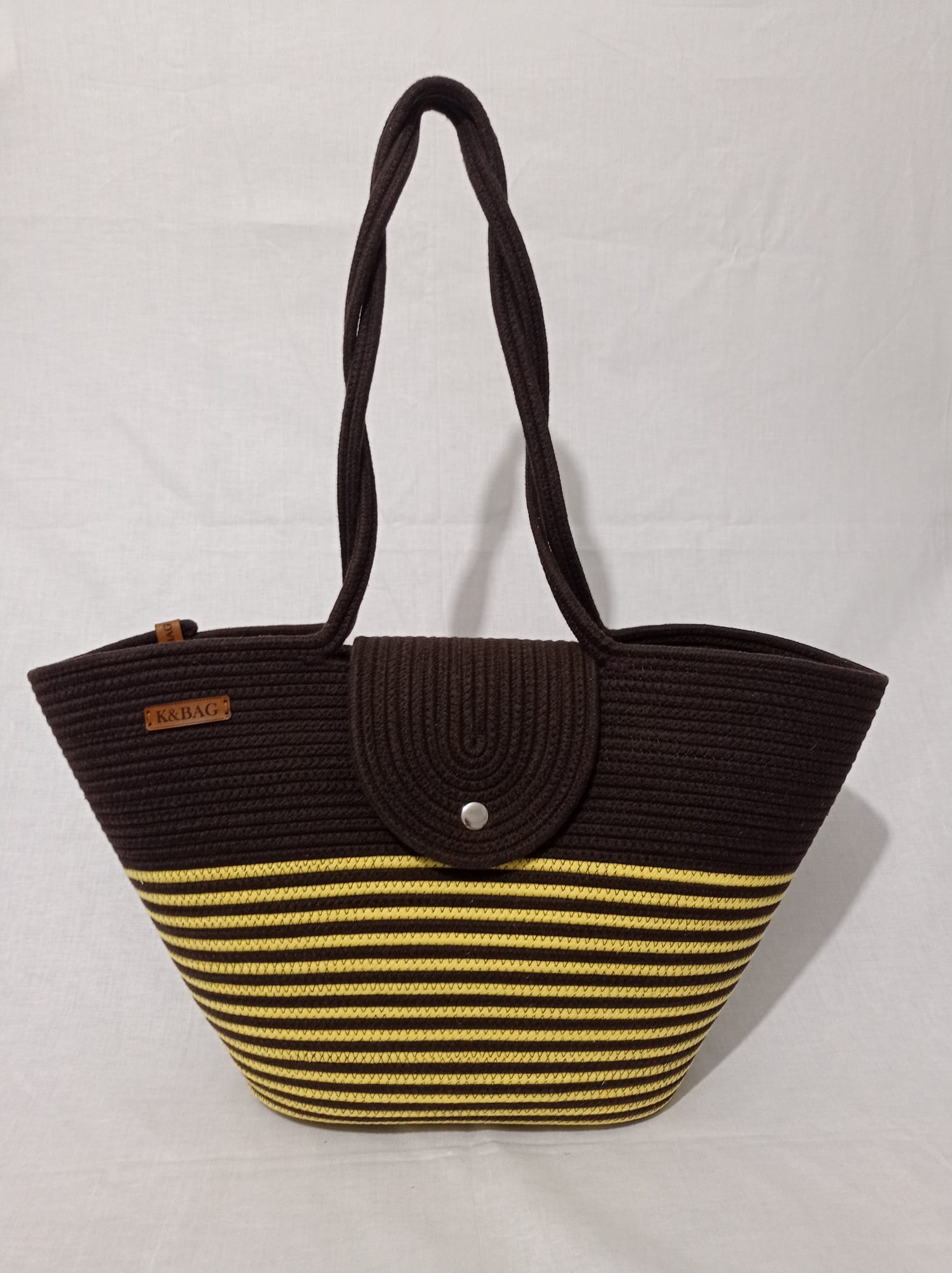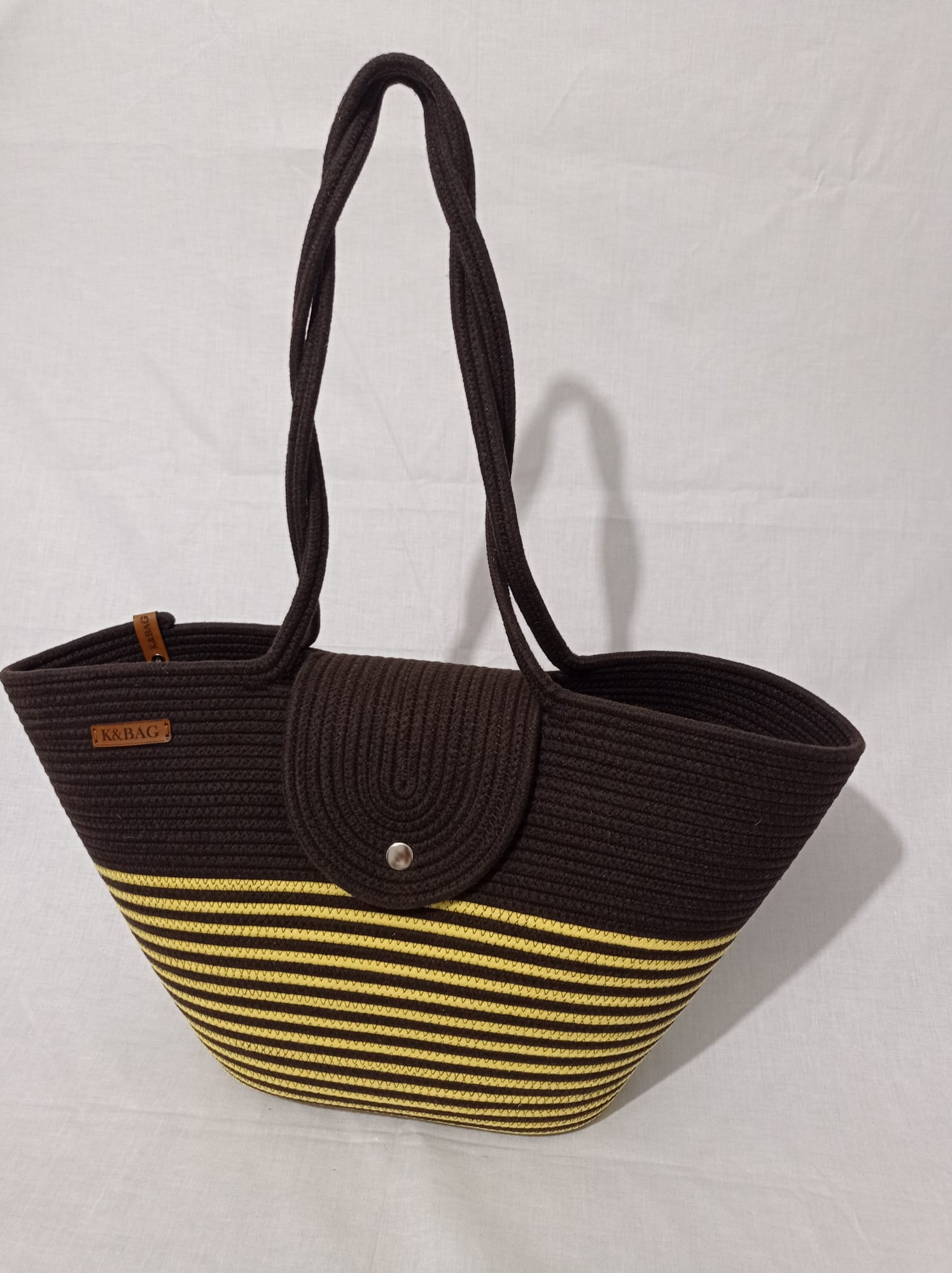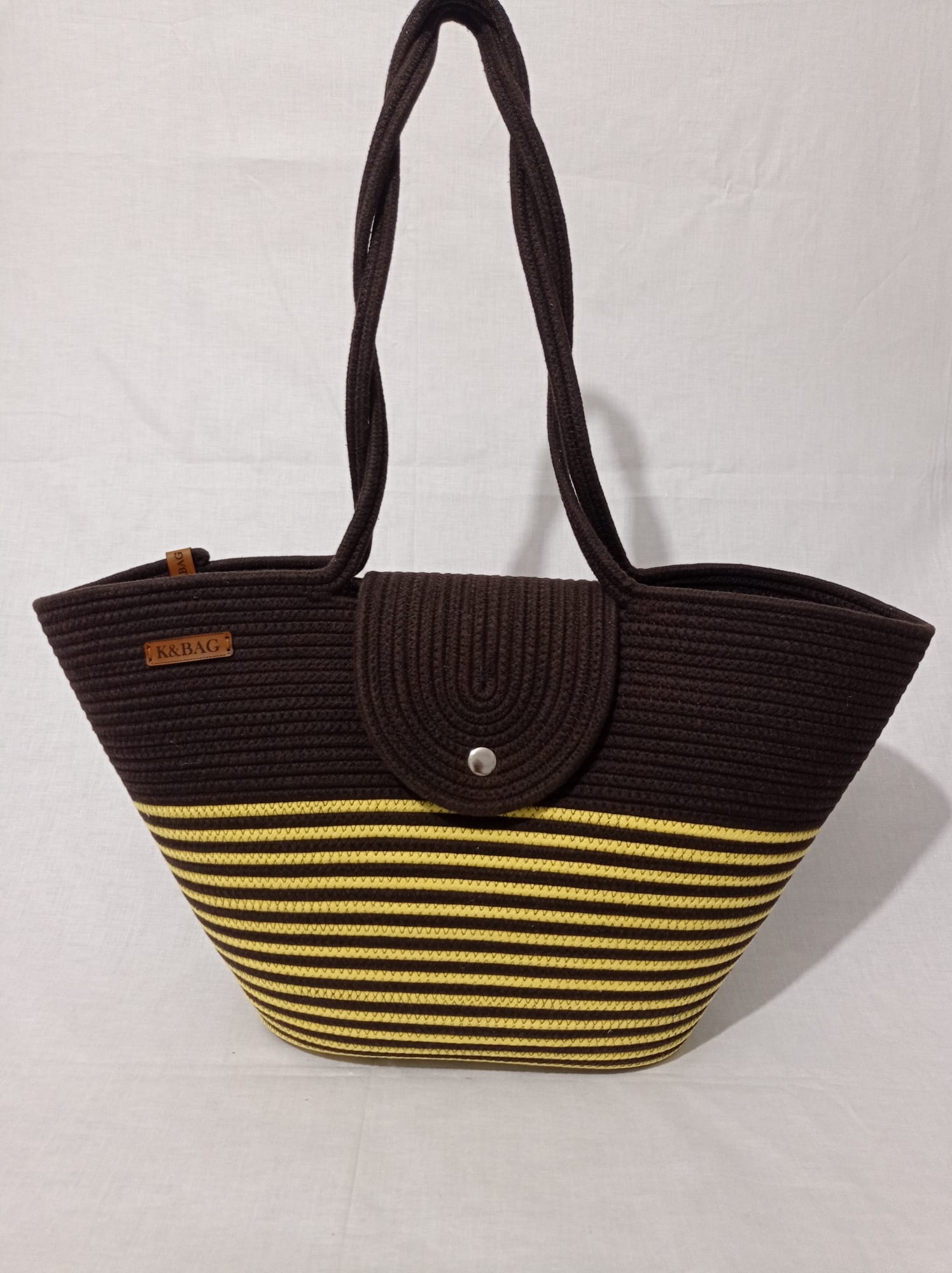 Kahverengi_Sarı kapaklı çanta, pamuklu jüt Kordon ip, yükseklik 30 cm genişlik 45 cm sap 70 cm uzunlukta