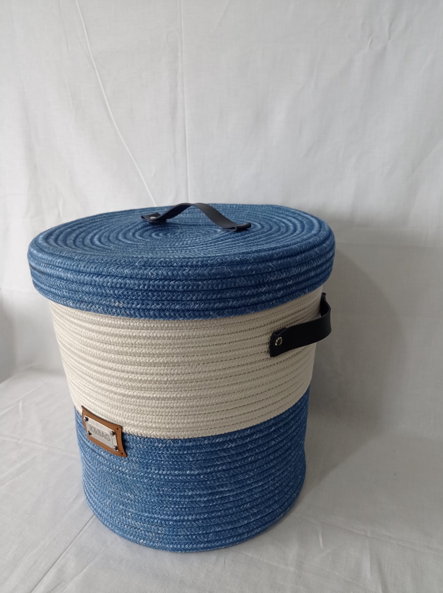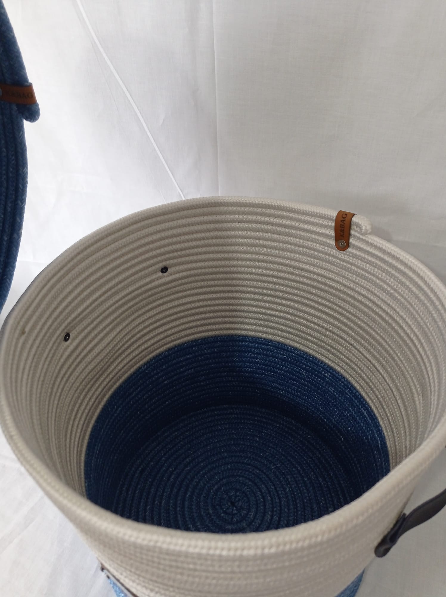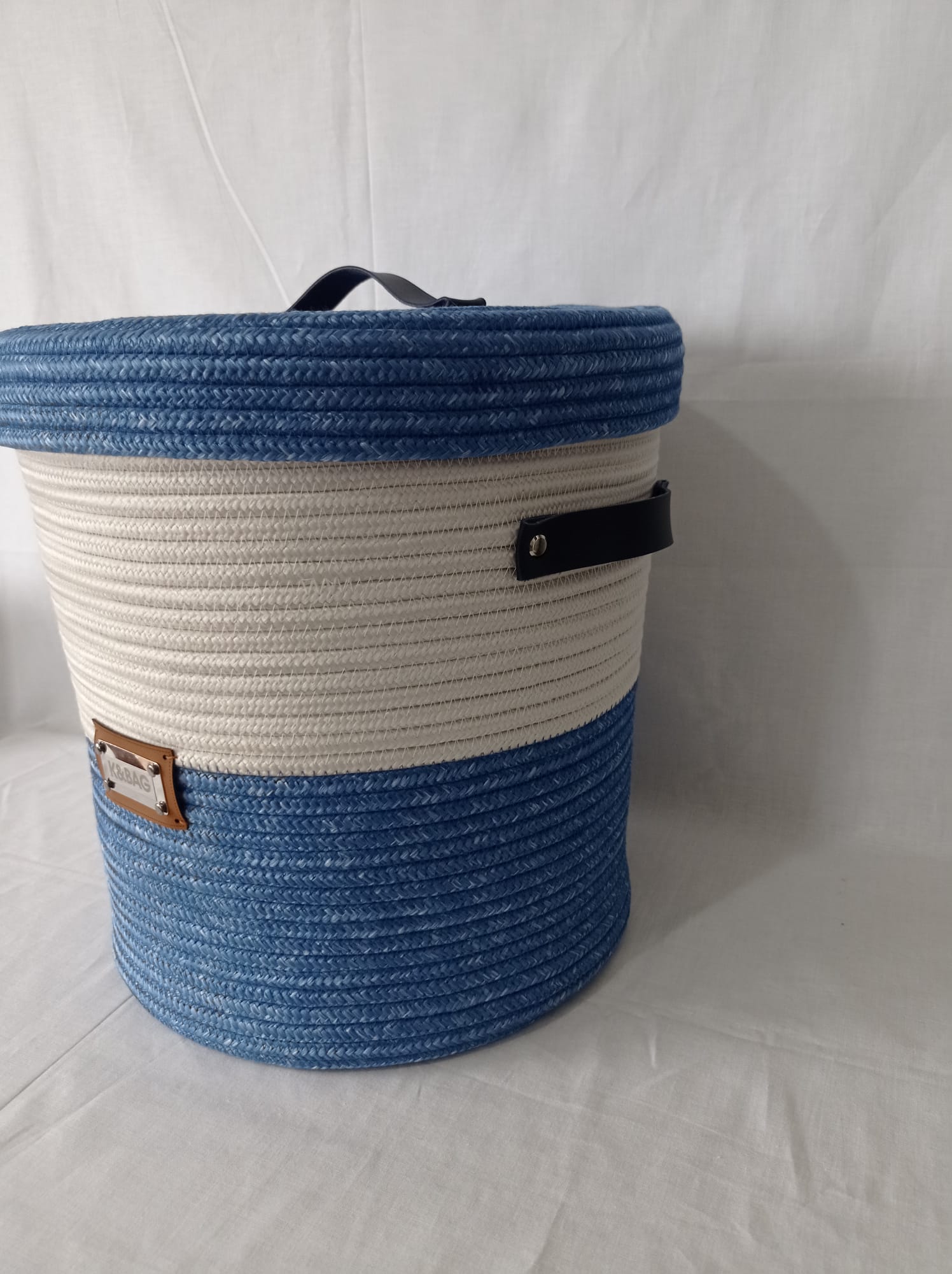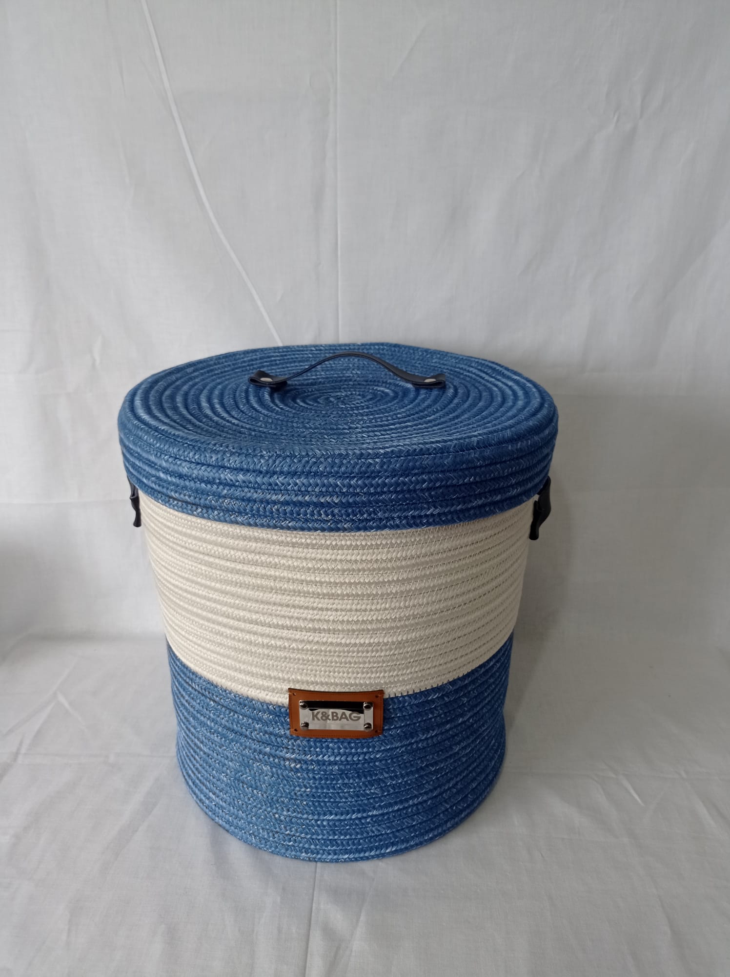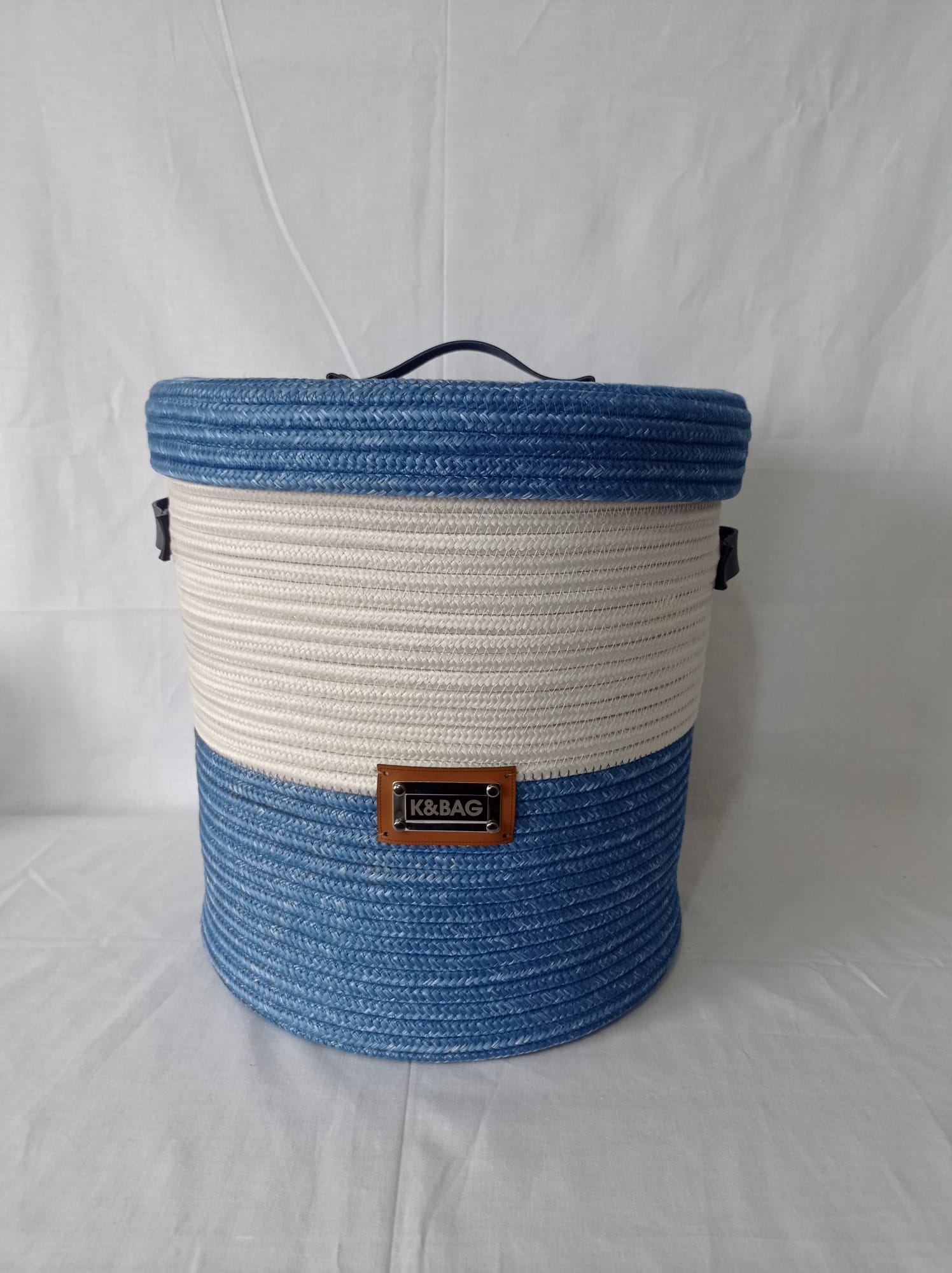 Koyu mavi-beyaz renkte polyester jüt ipten mini kapaklı sepet yükseklik 33 cm çap 30 cm