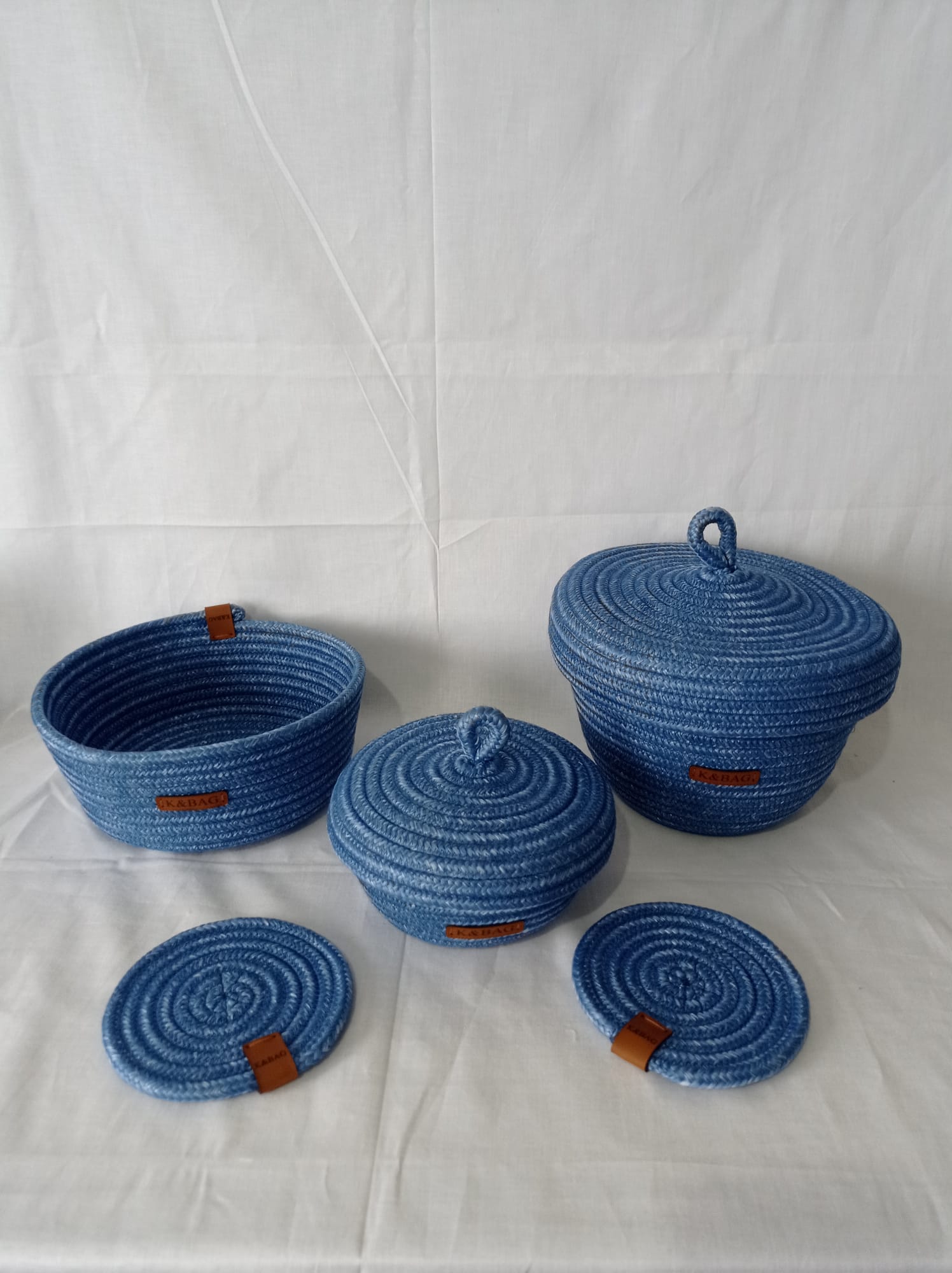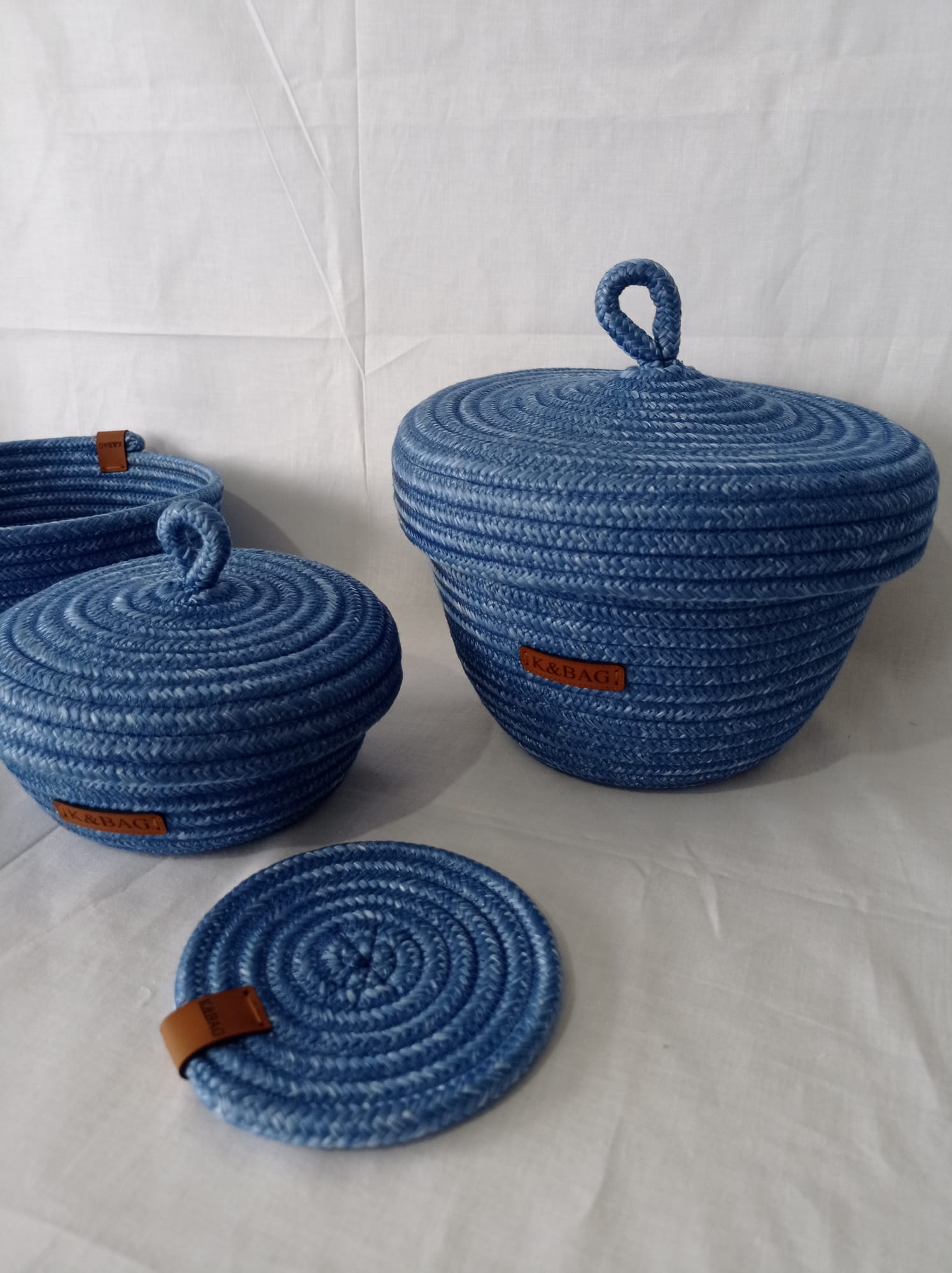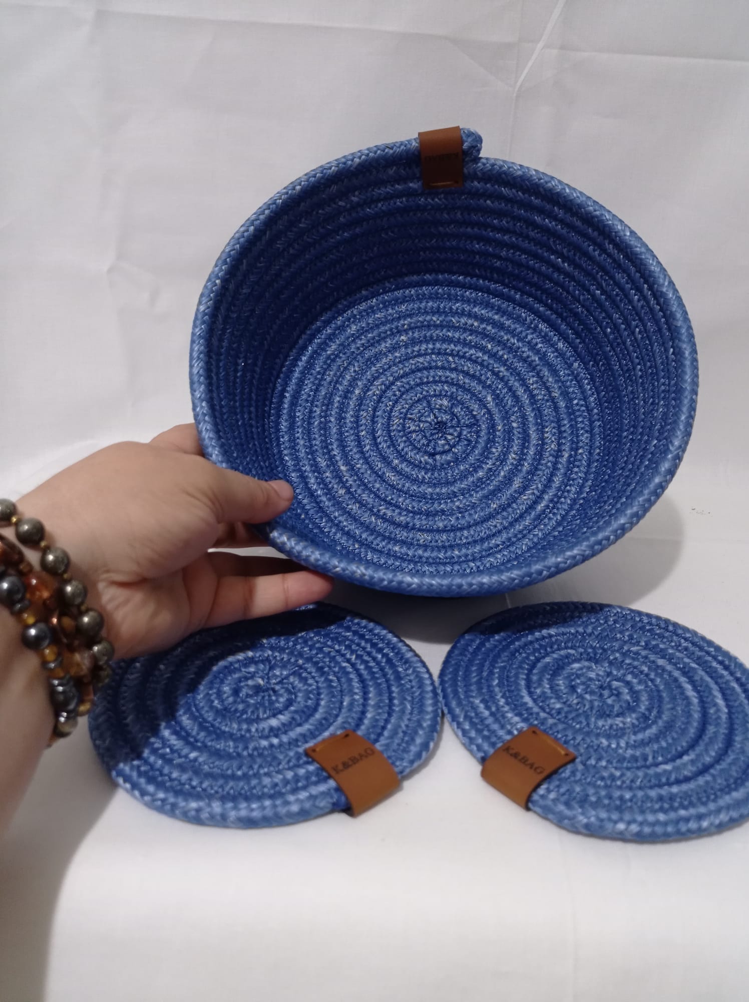 Üçlü organizer set,2 adet bardak altlığı hediyeli. Koyu mavi polyester jüt ipten organizer. Büyük boy kapaklı yükseklik 17 cm çap 21 cm Küçük boy kapaklı yükseklik 10 cm çap 15 cm kapaksız sepet yükseklik 10 cm çap 22 cm