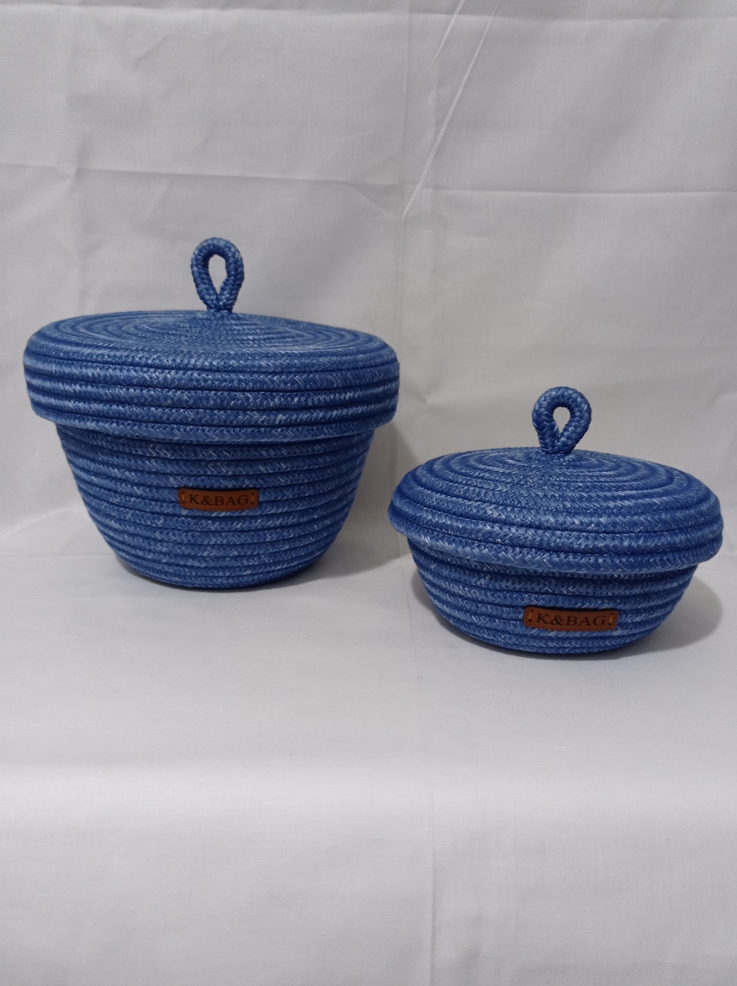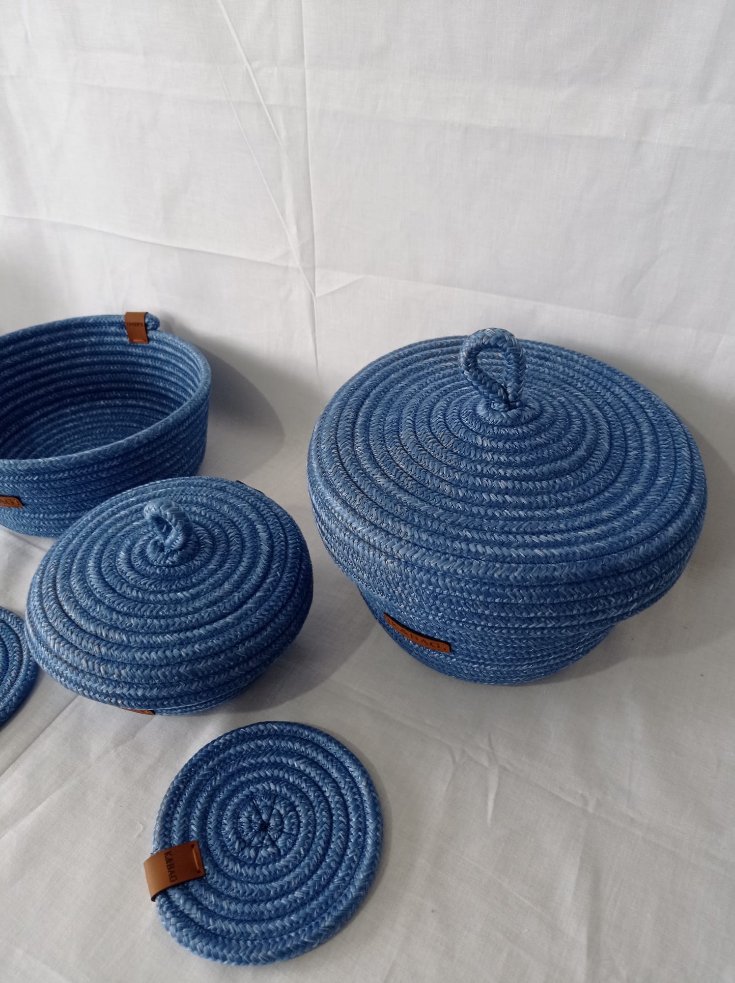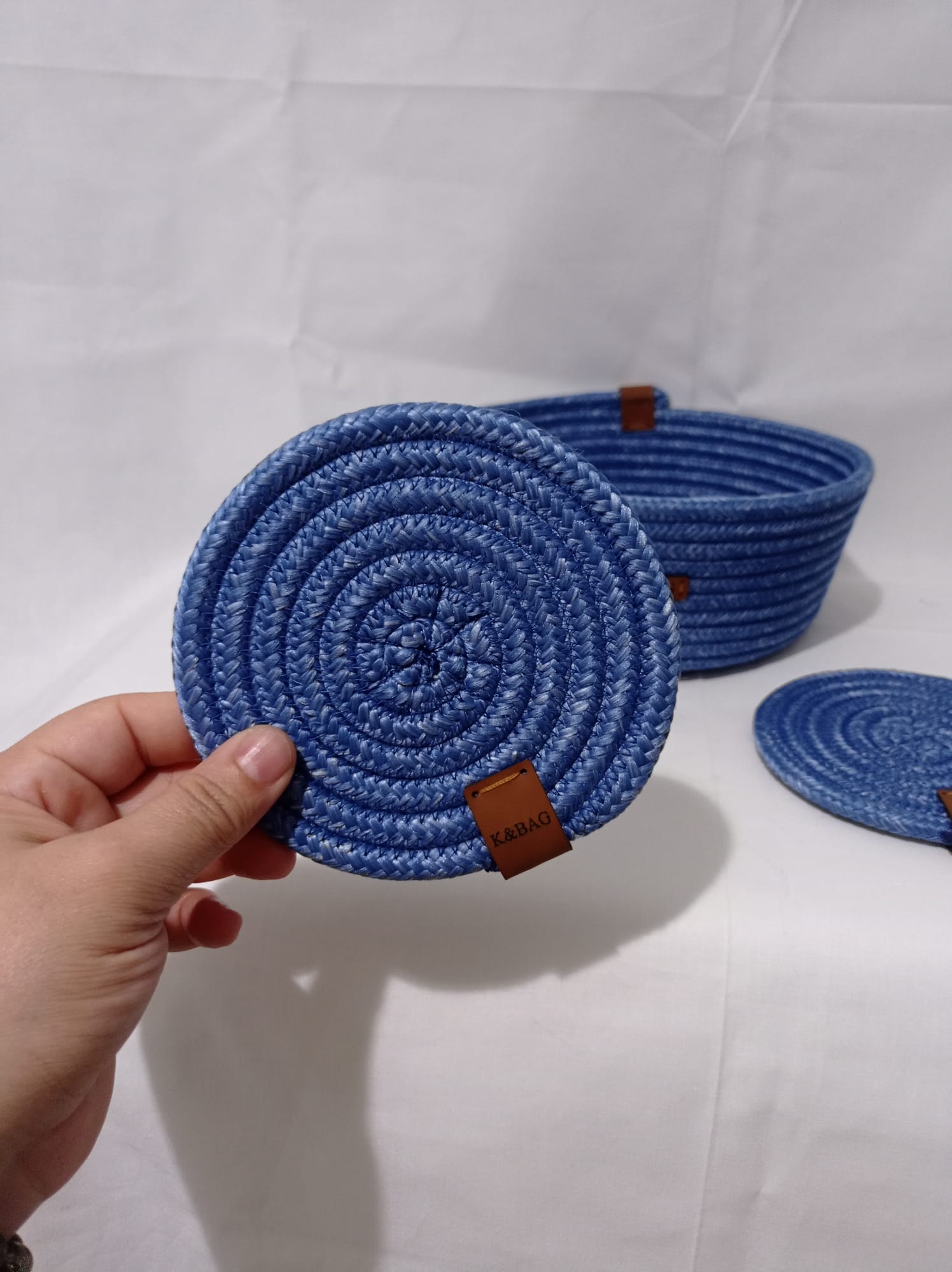 Üçlü organizer set,2 adet bardak altlığı hediyeli. Koyu mavi polyester jüt ipten organizer. Büyük boy kapaklı yükseklik 17 cm çap 21 cm Küçük boy kapaklı yükseklik 10 cm çap 15 cm kapaksız sepet yükseklik 10 cm çap 22 cm