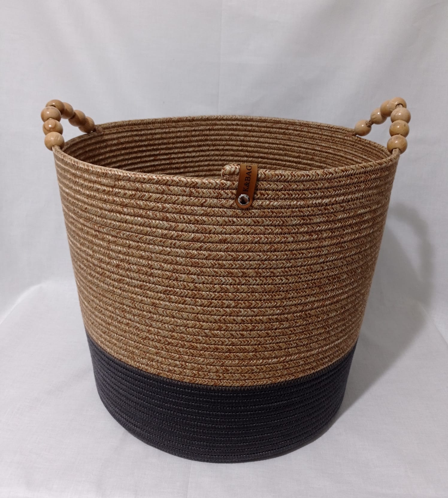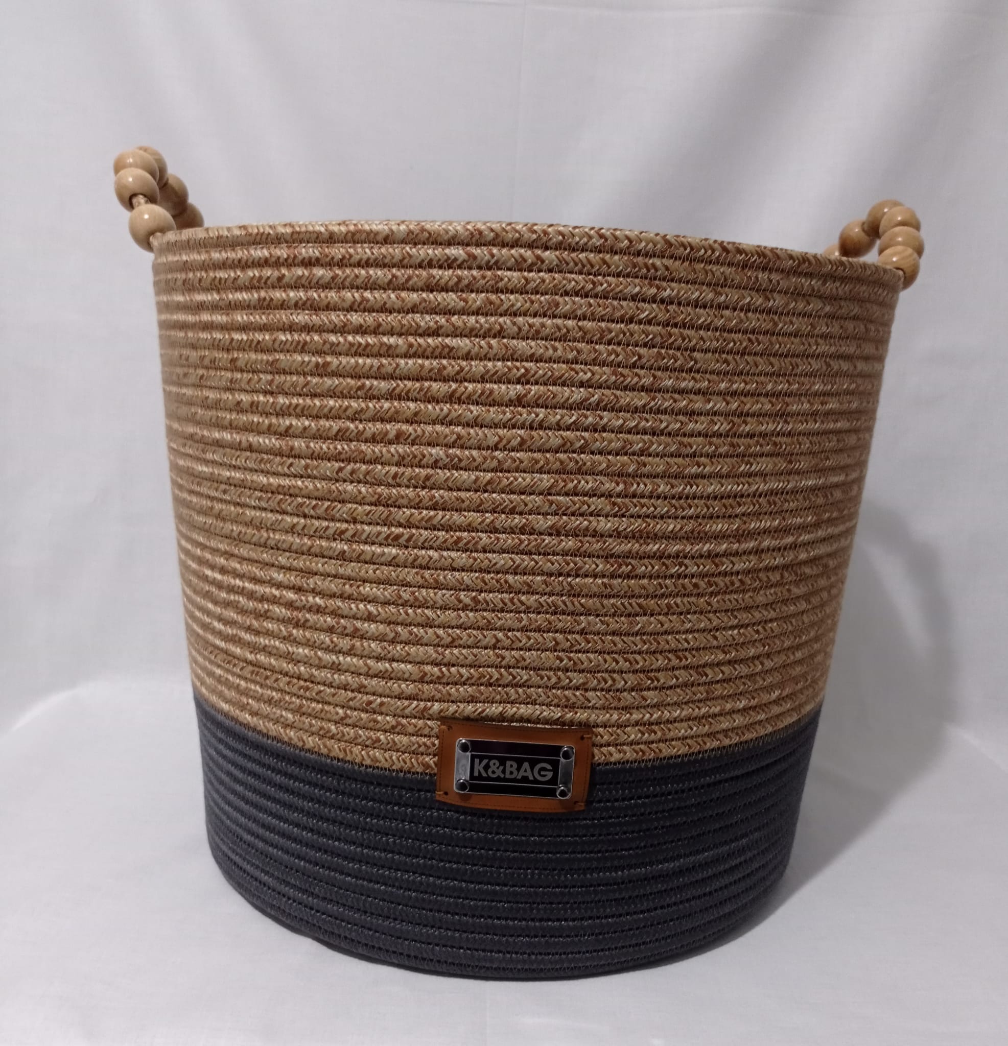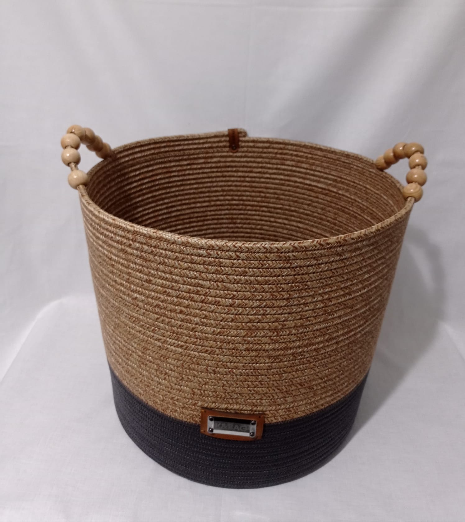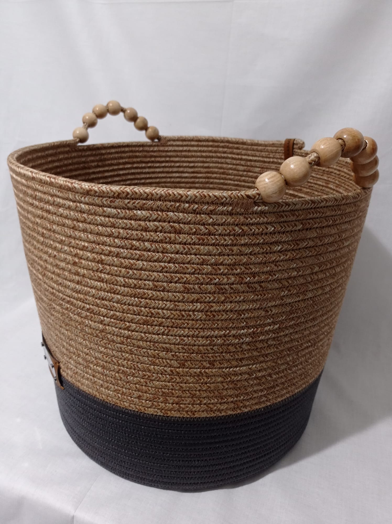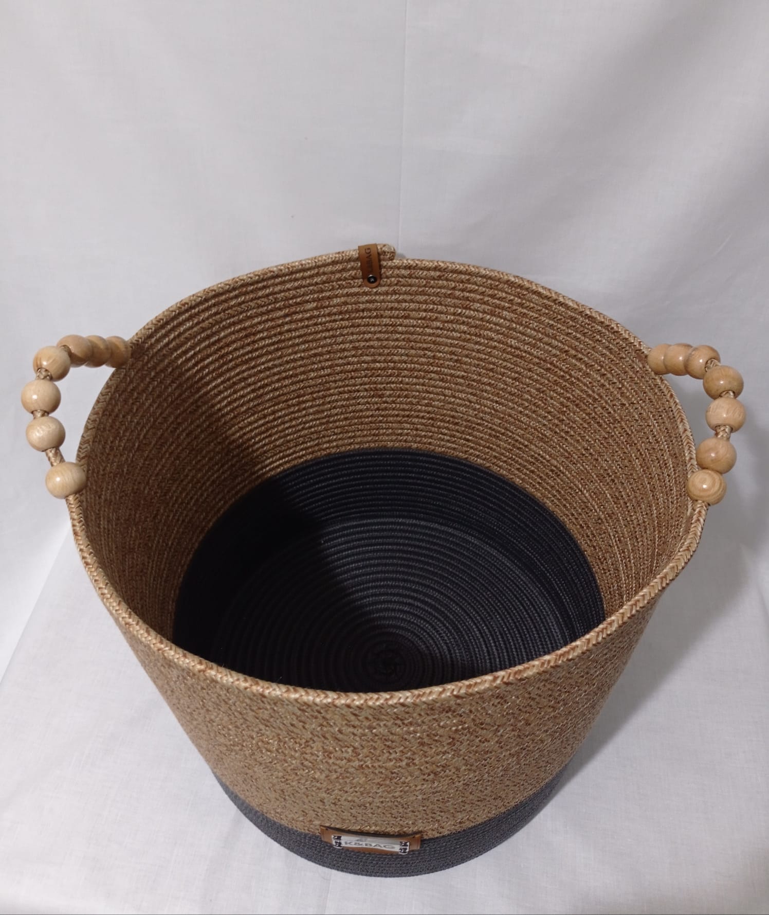 Polyester jüt ipten ahşap boncuklu kulplar,antrasit-hasır kombin sepet. Yükseklik 33 cm çap 37 cm
